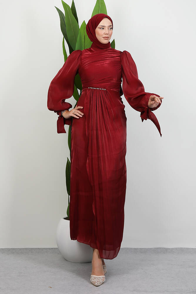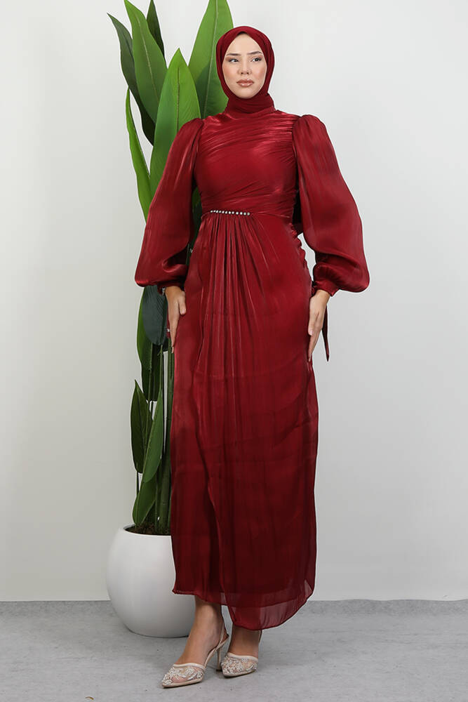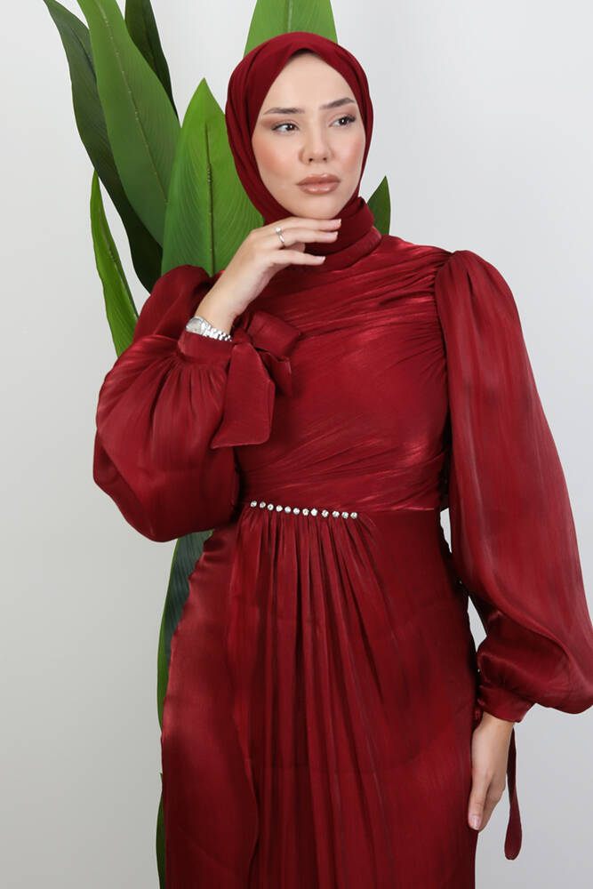 Omzu Taşlı Saten Abiye Bordo