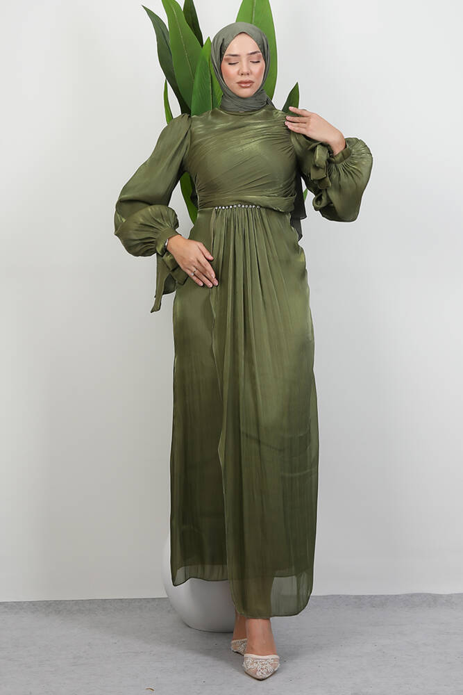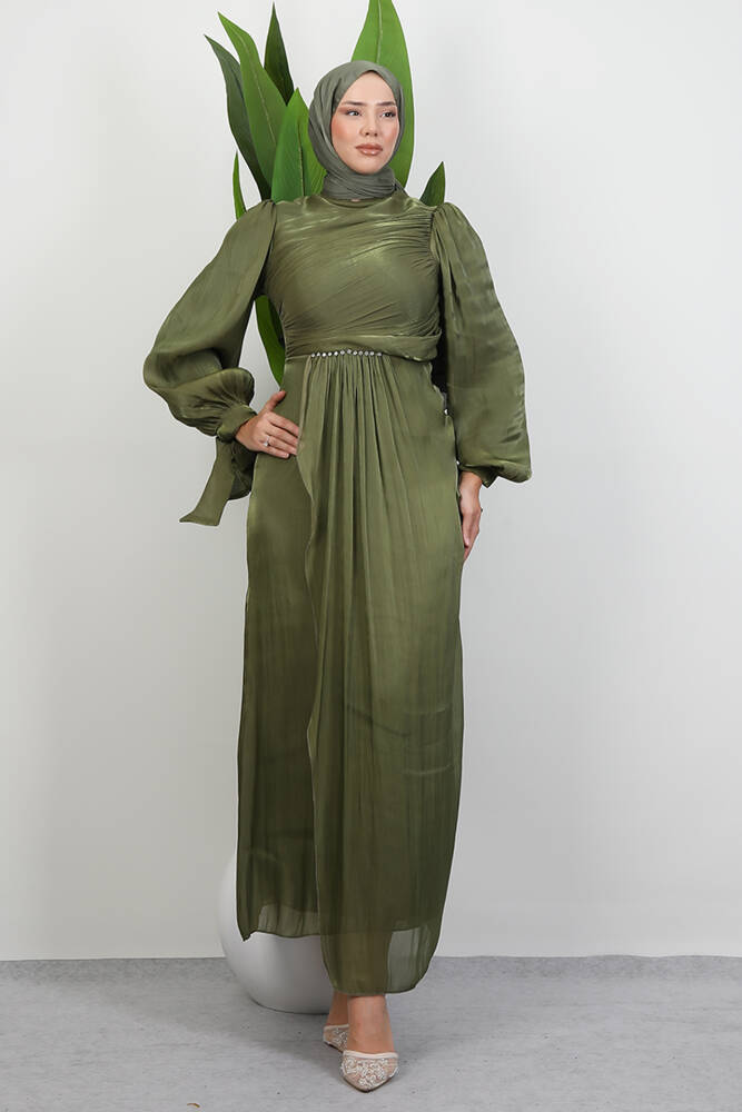 Omzu Taşlı Saten Abiye Haki