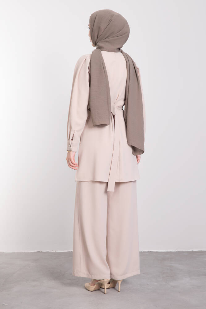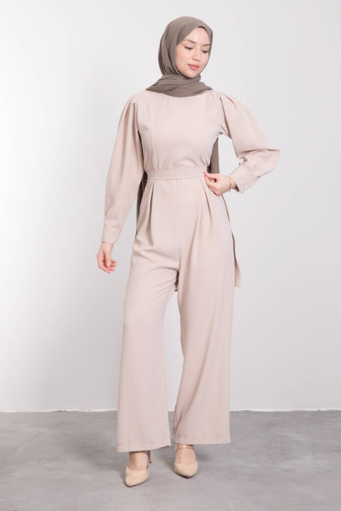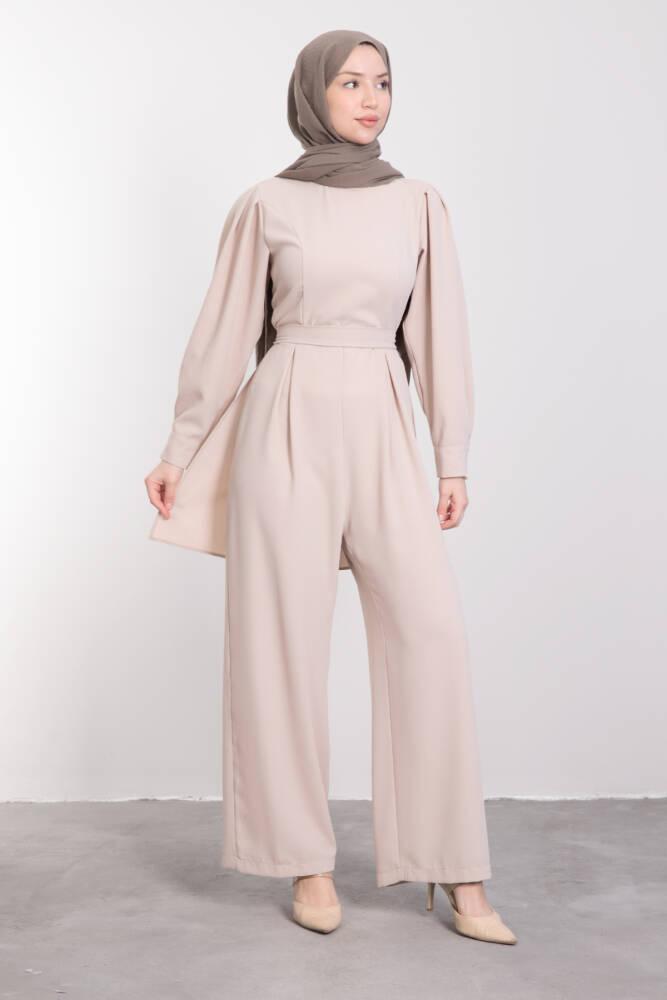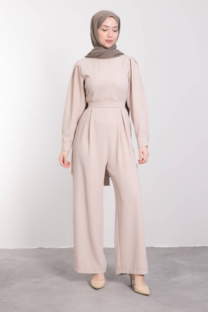 Arkası Parça Detaylı Tesettür Tulum Vizon