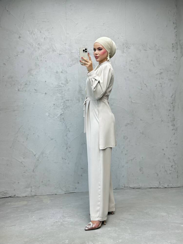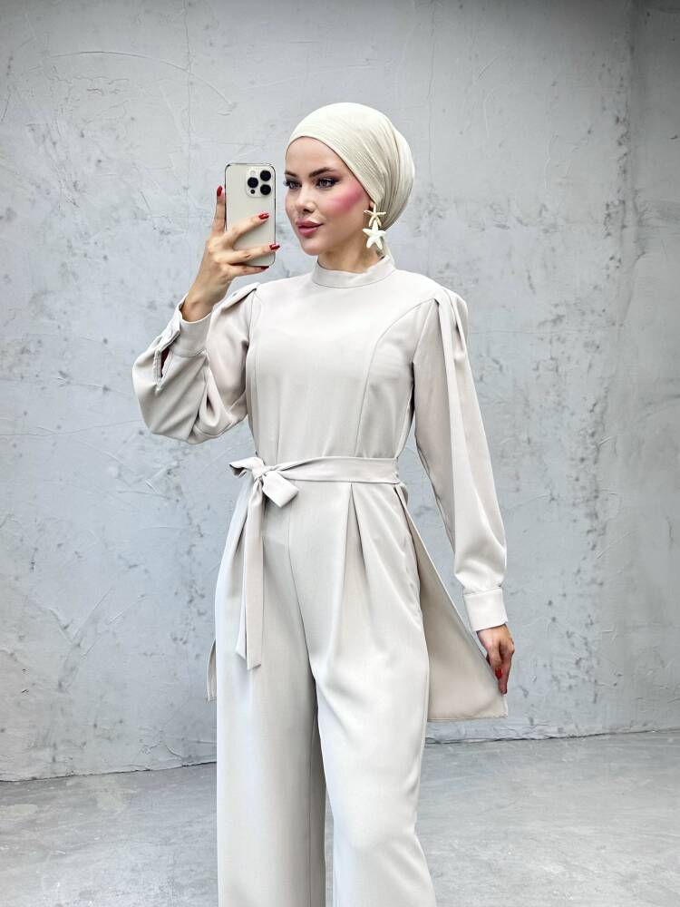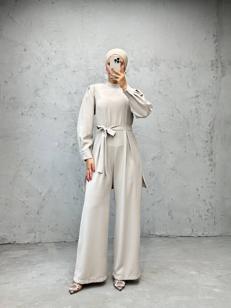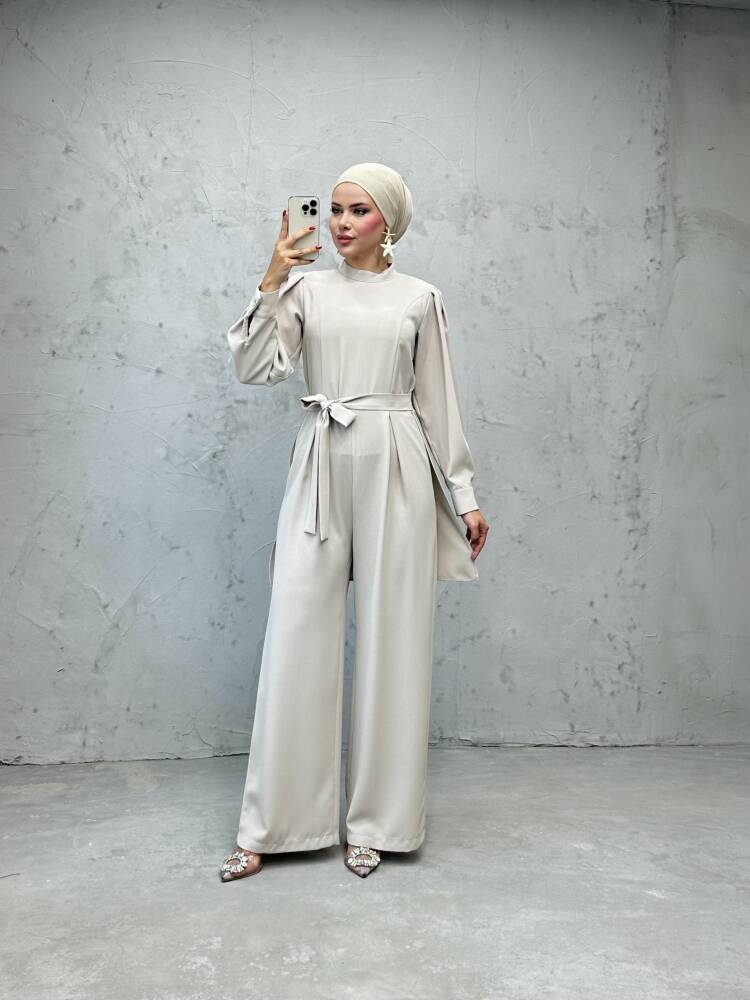 Arkası Parça Detaylı Tesettür Tulum Vizon