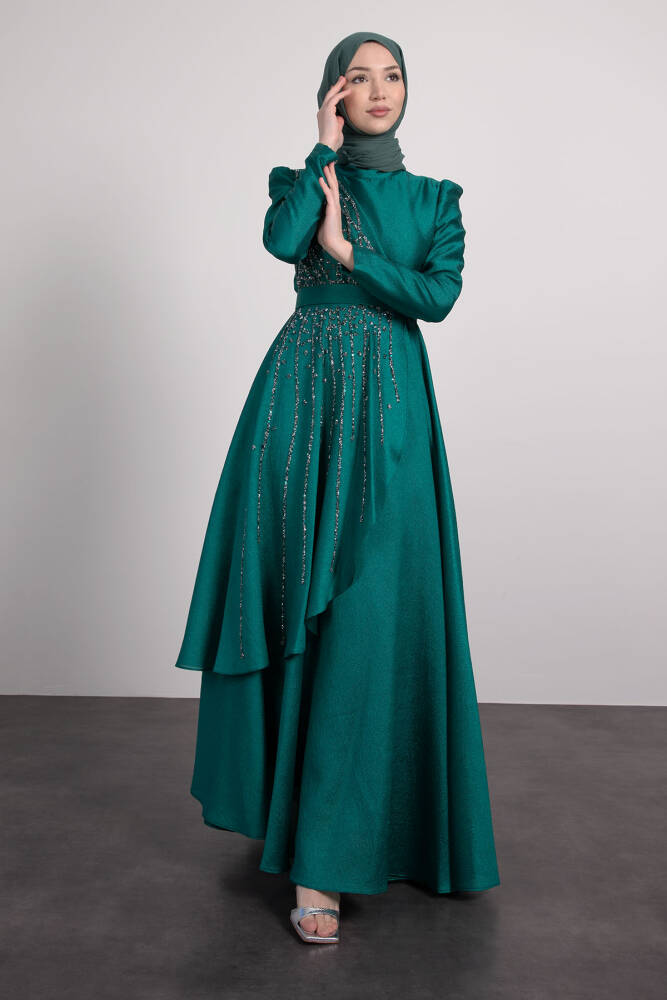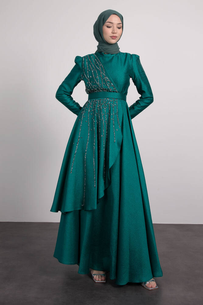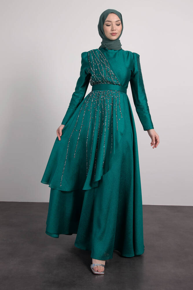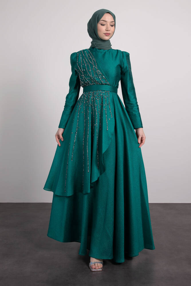 Asimetrik Taş İşlemeli Elbise Zümrüt