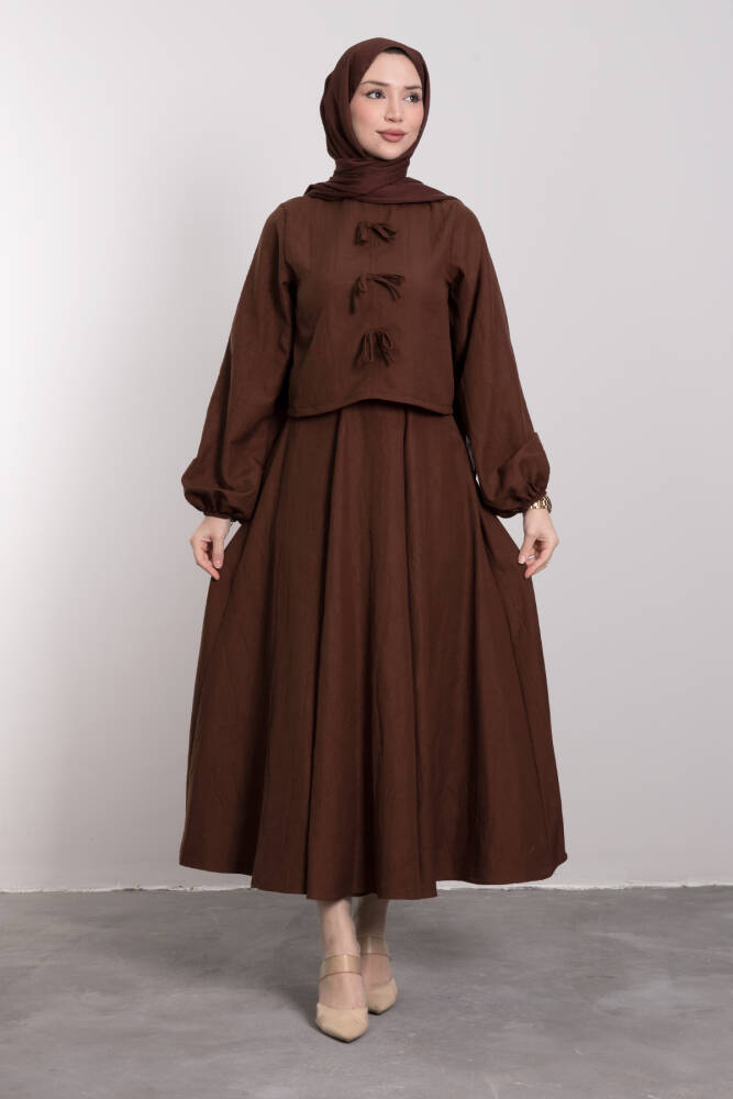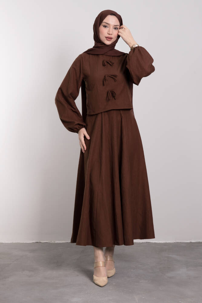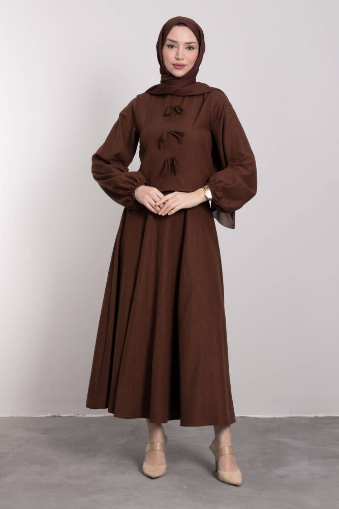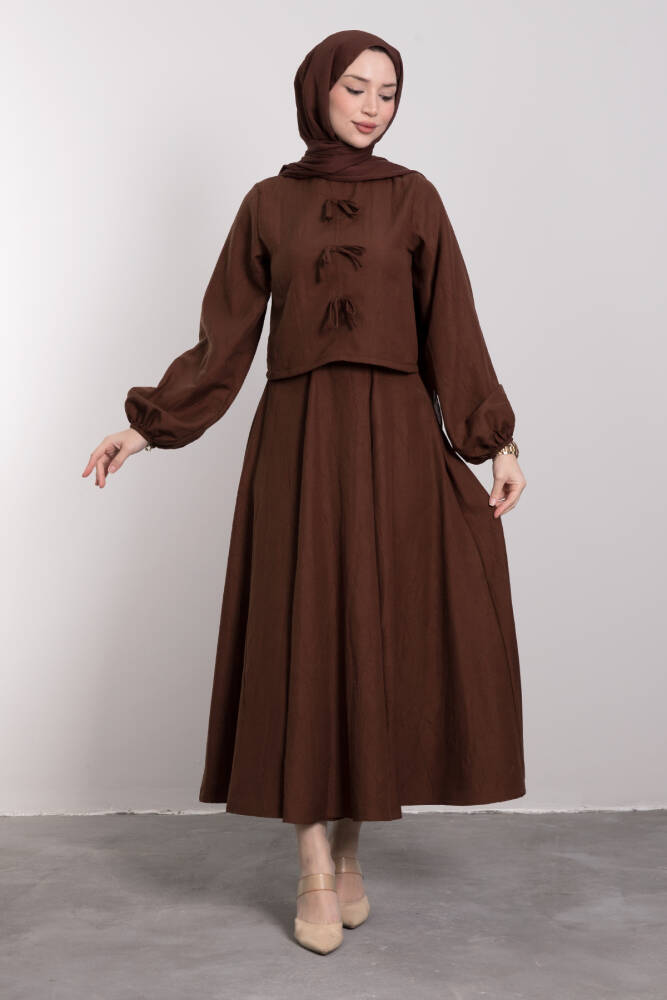 Bağcık Fiyonklu Etekli Takım Kahverengi