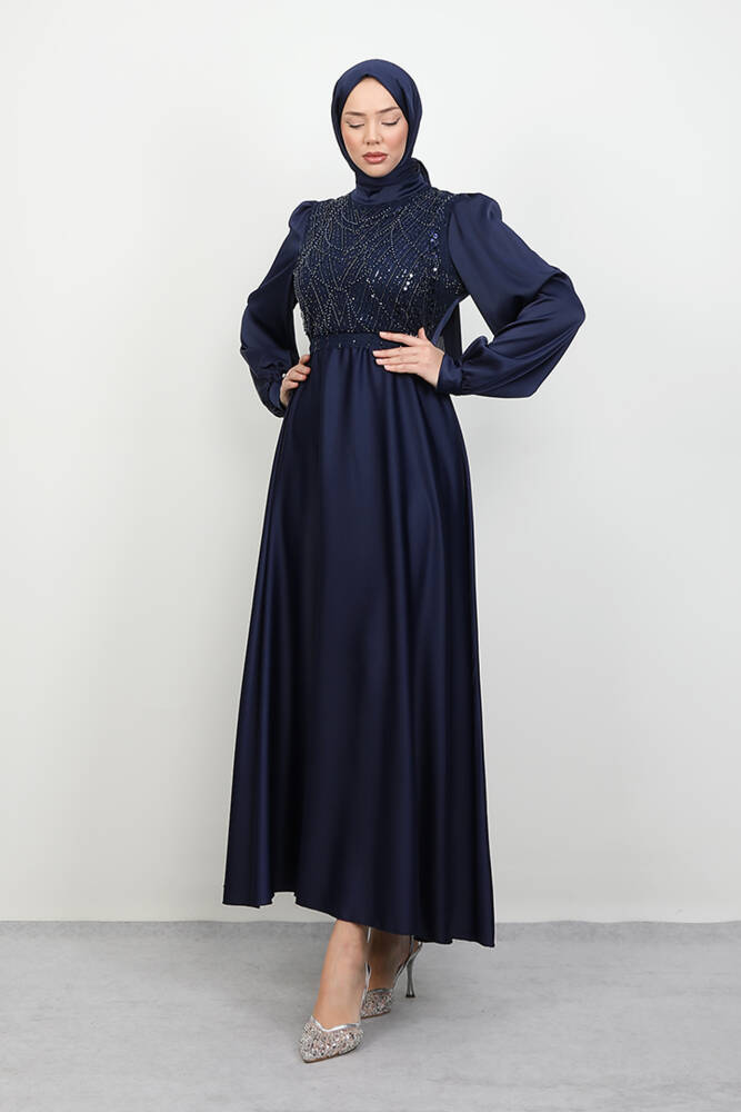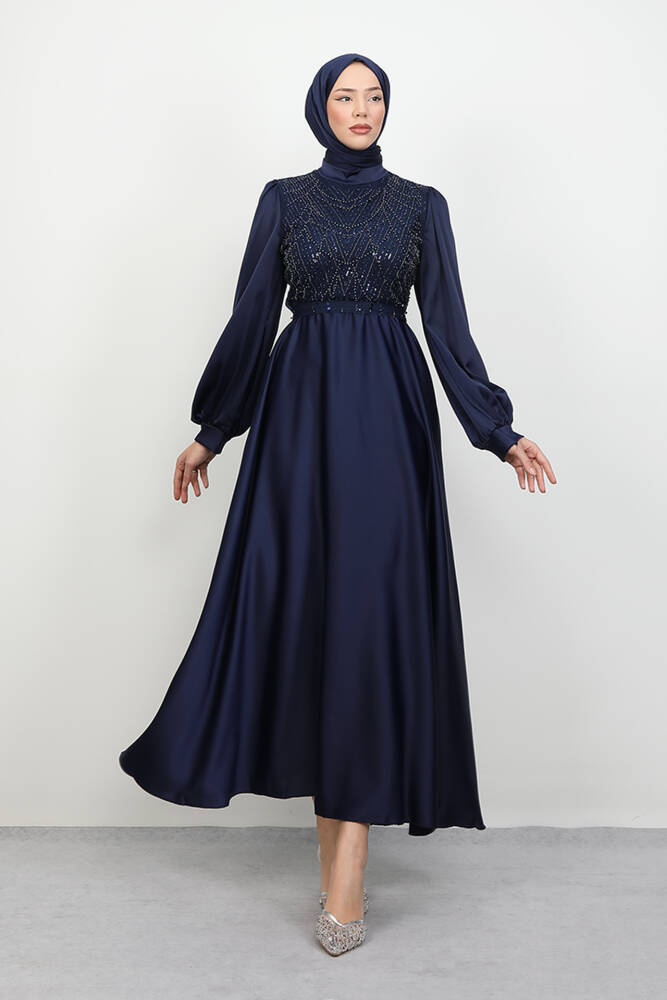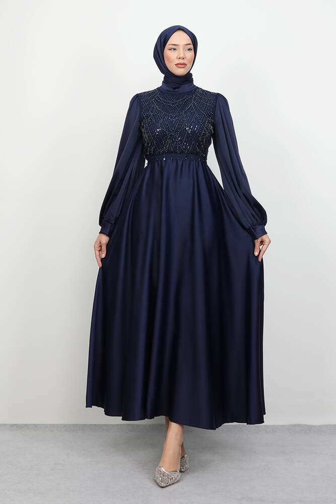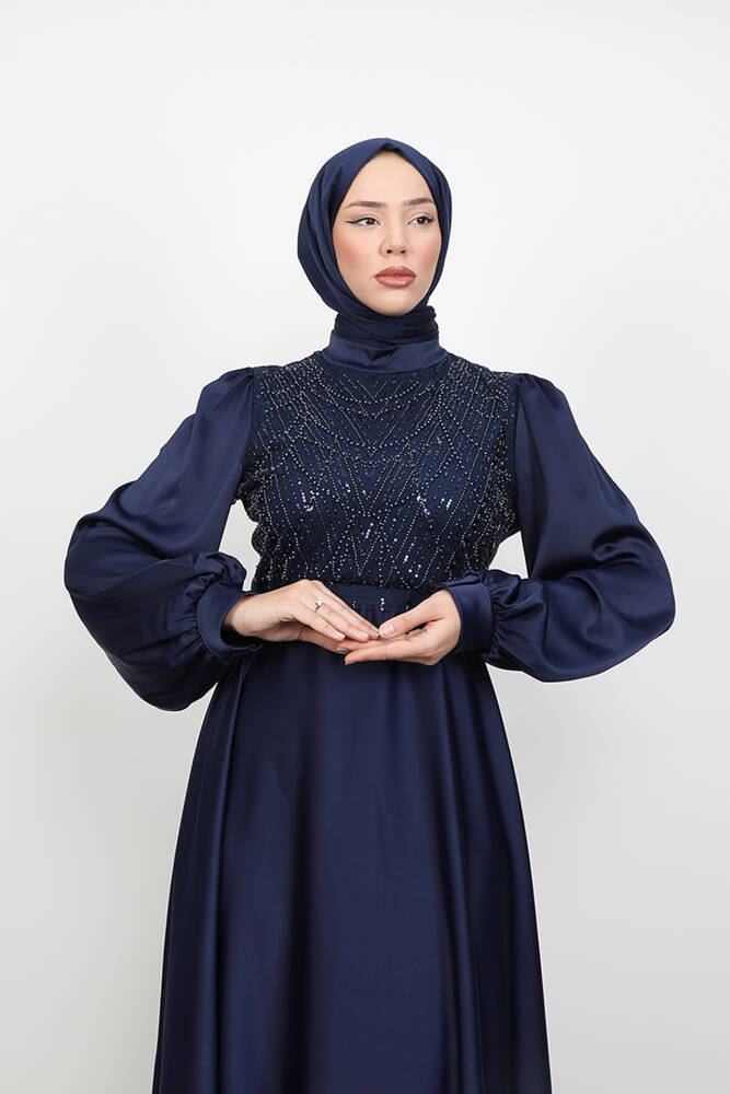 Balon Kol Saten Abiye Lacivert