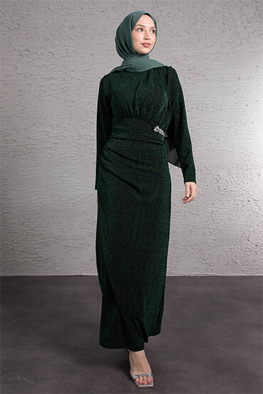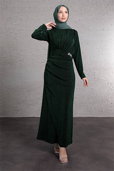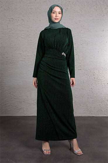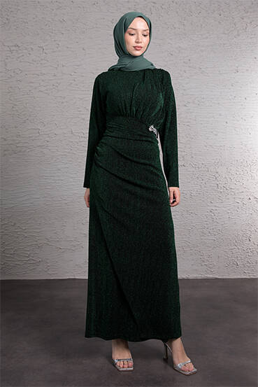 Beli Taş İşlemeli Büzgülü Elbise Zümrüt