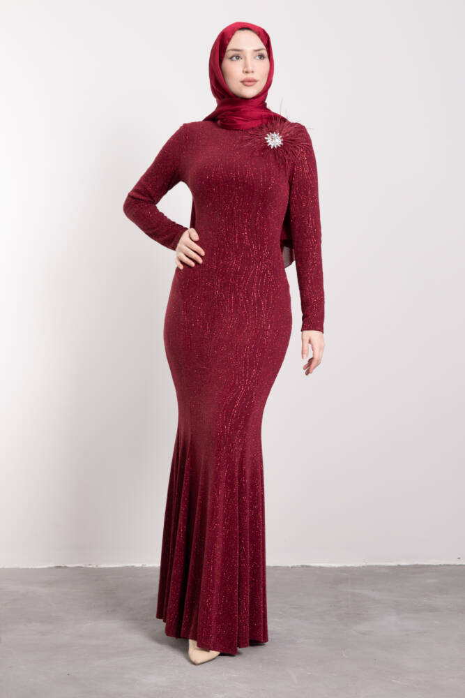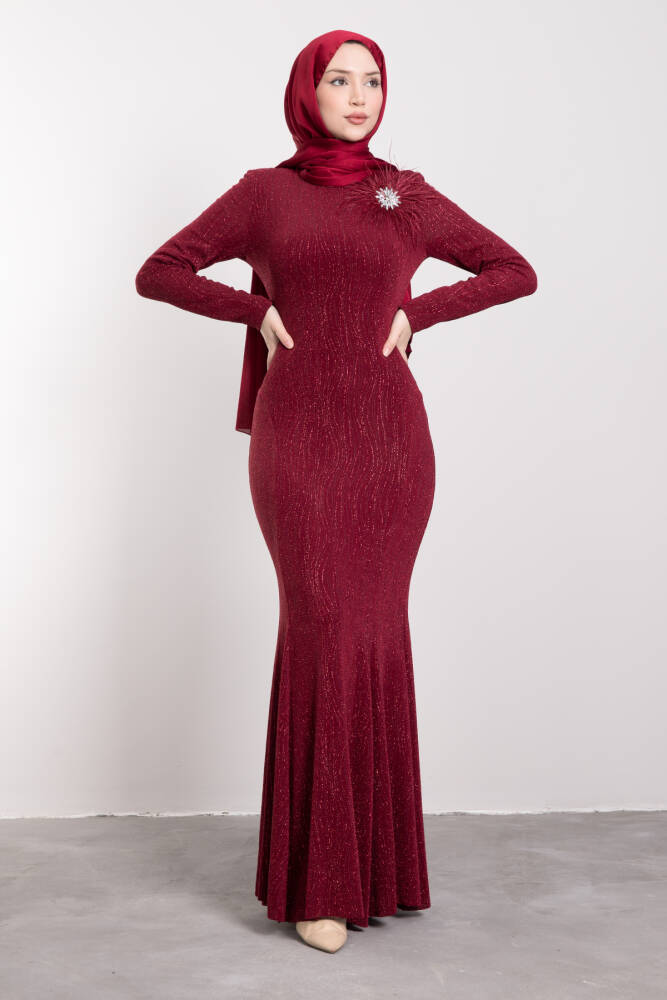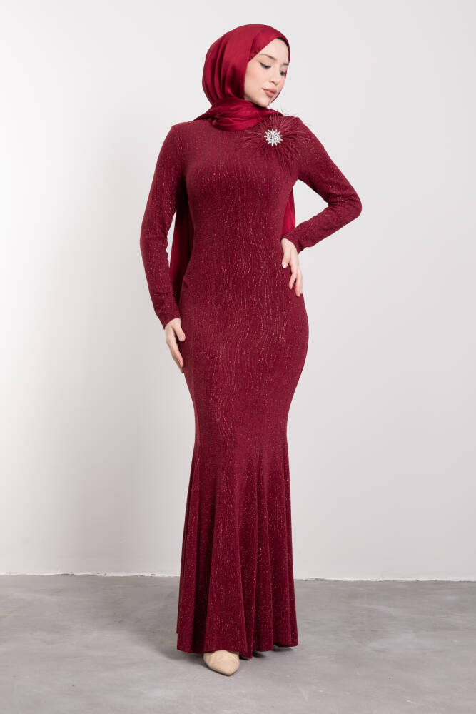 Broş Detaylı Balık Elbise Bordo
