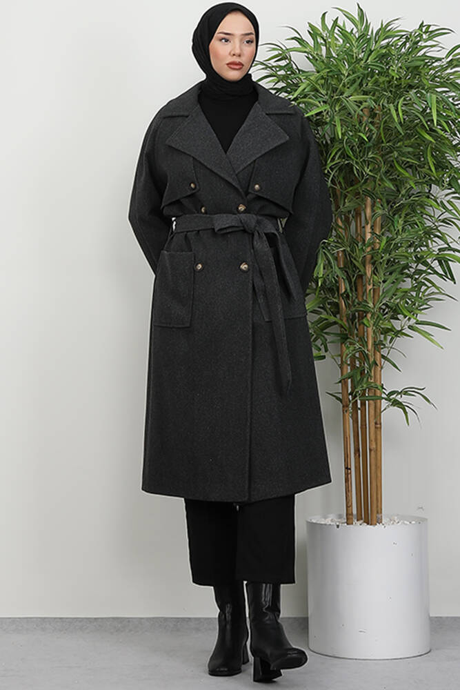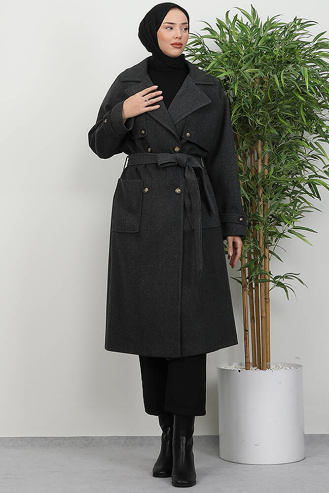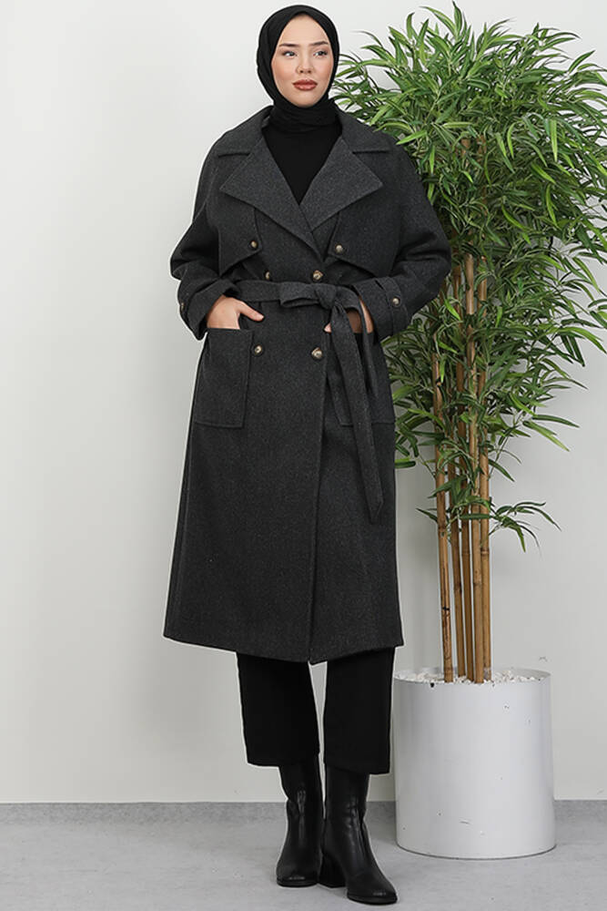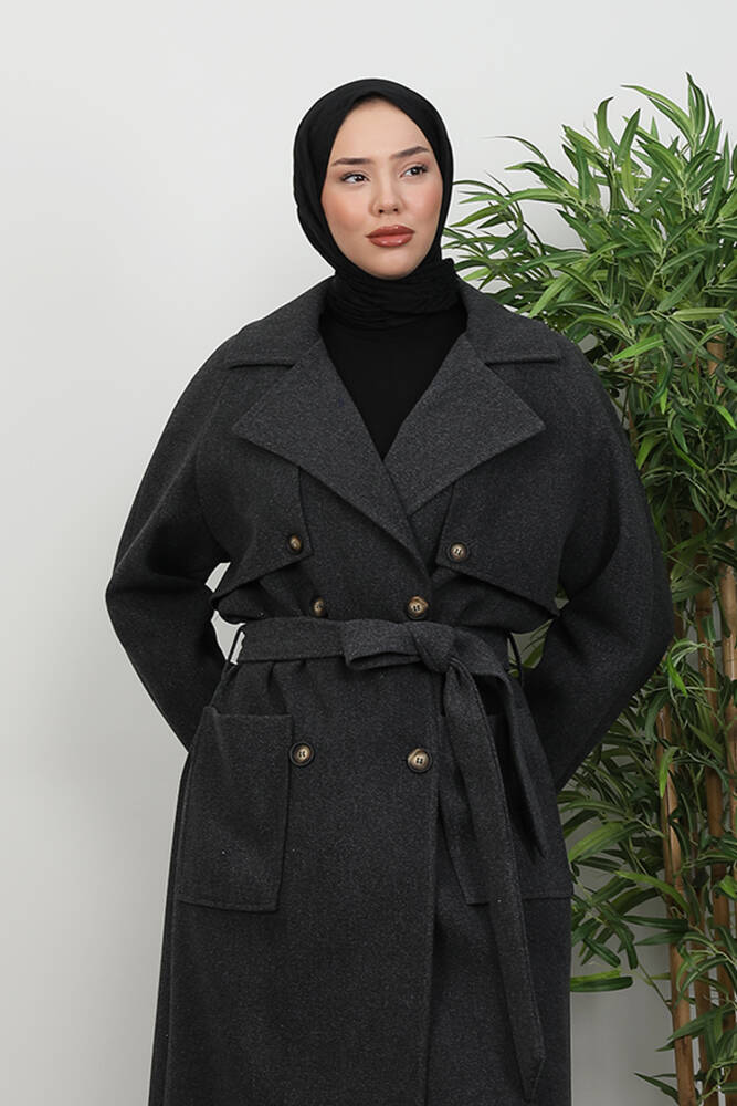 Uzun 6 Düğmeli Kaban Koyu Gri