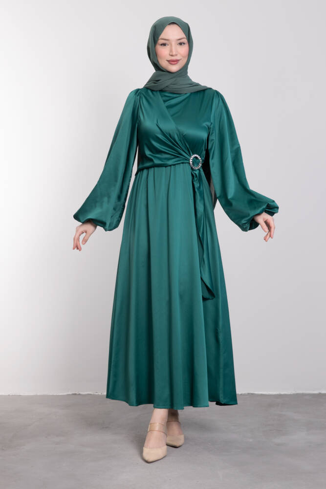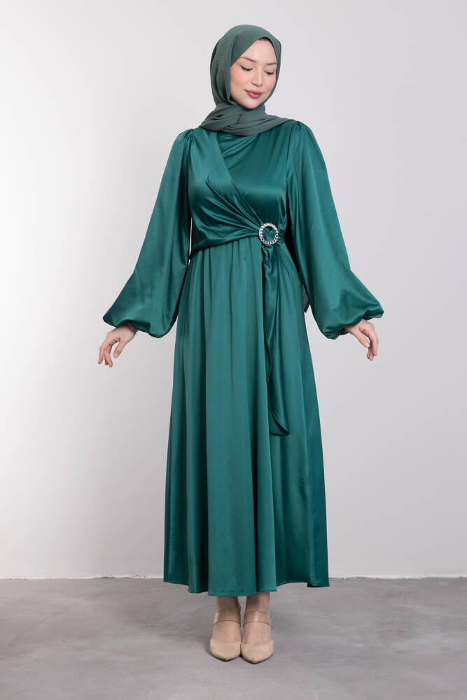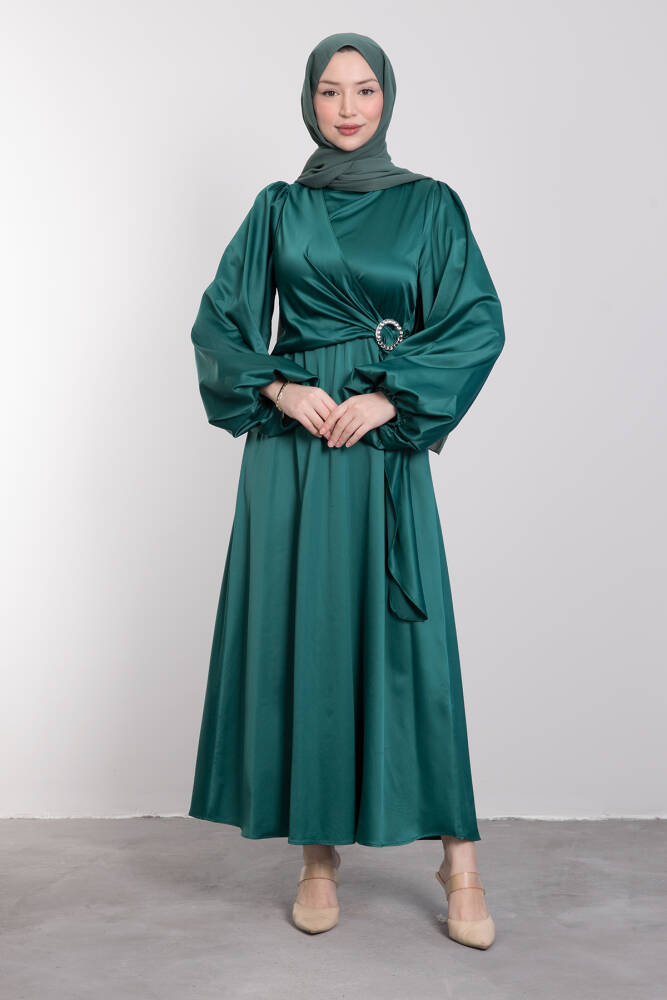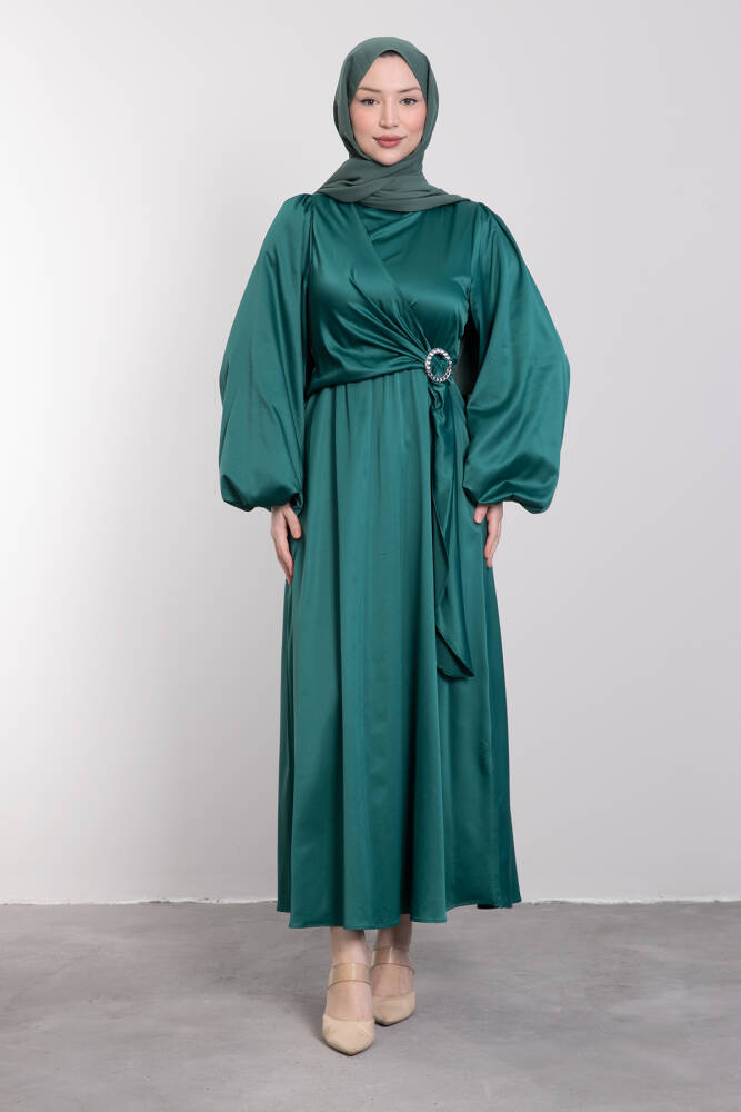 Çapraz Tokalı Rahat Kesim Elbise Zümrüt
