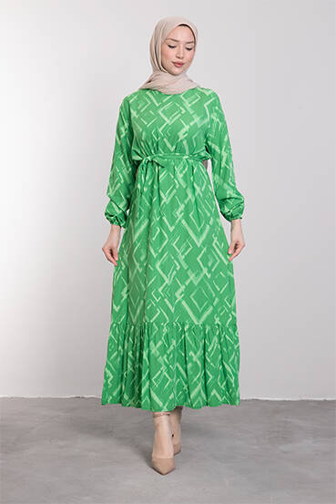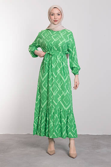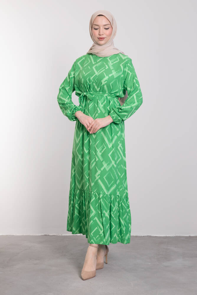 Desenli Pamuklu Kuşaklı Elbise Fıstık Yeşil