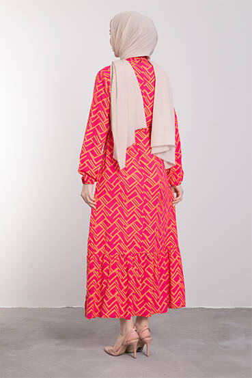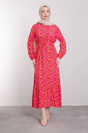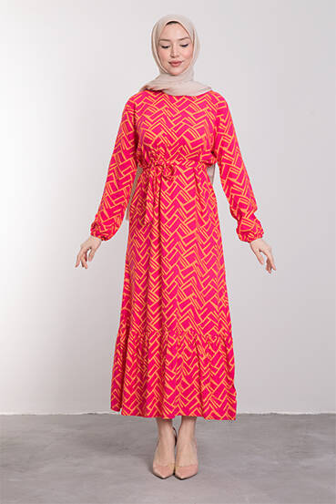 Desenli Pamuklu Kuşaklı Elbise Pembe