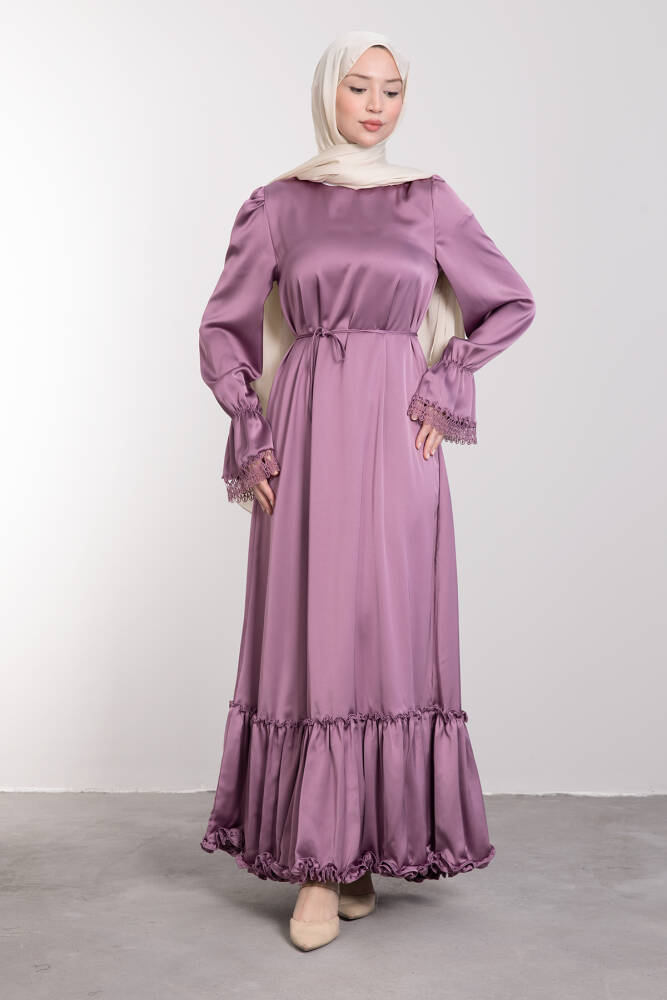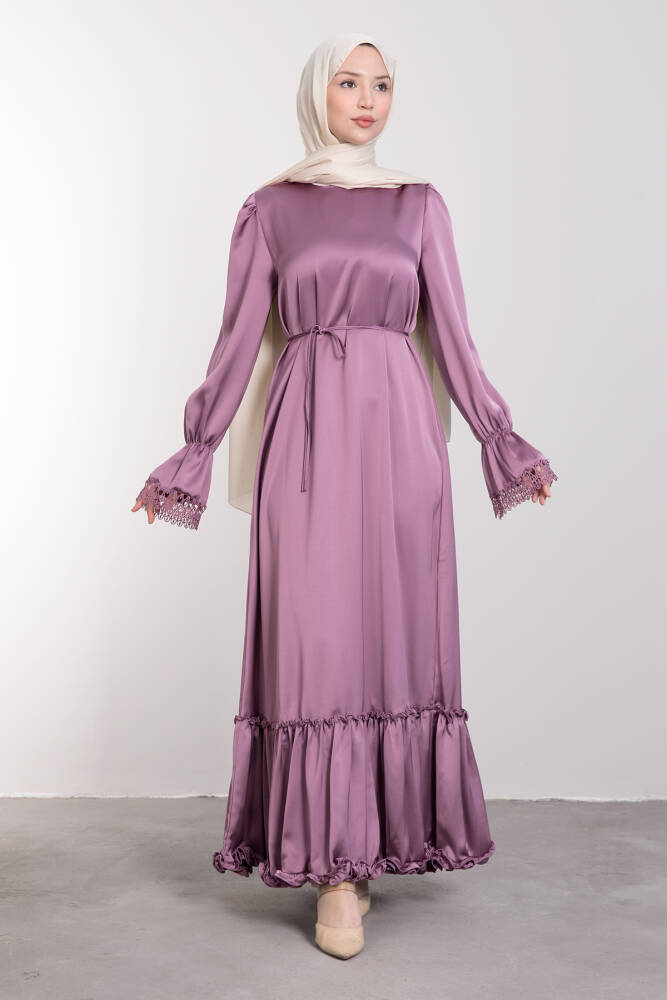 Fırfırlı Güpür Detaylı Elbise Lavanta