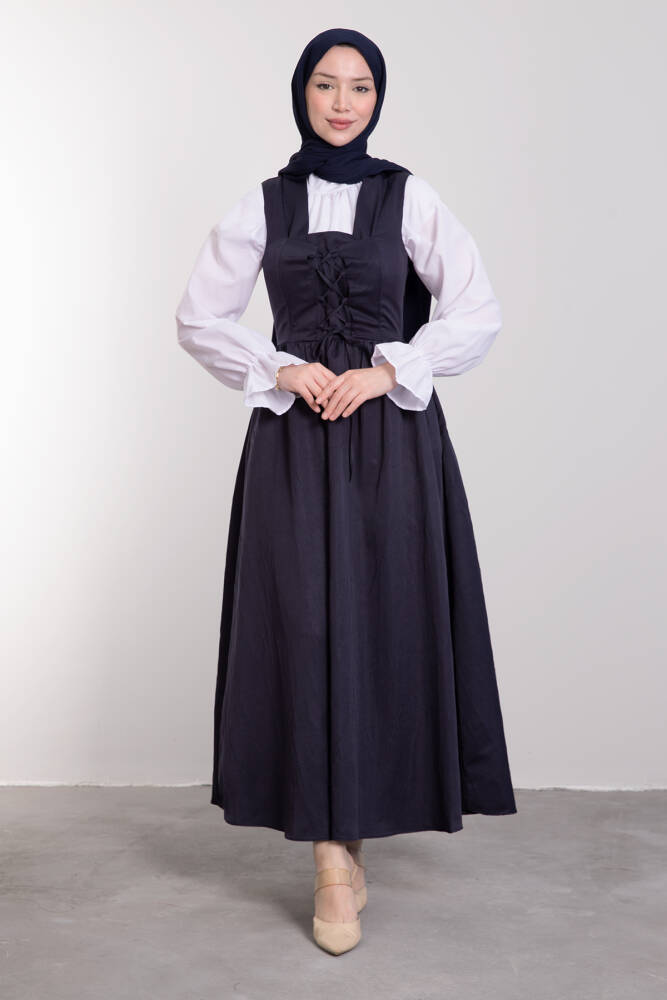 Geniş Askılı Çapraz Bağcıklı Elbise Lacivert