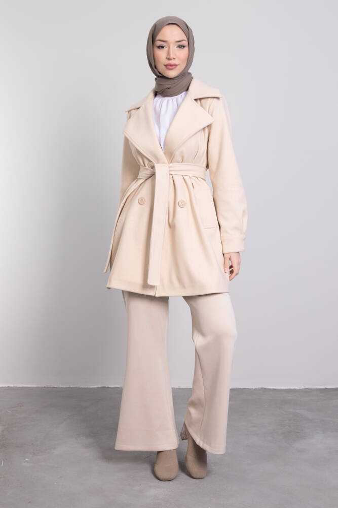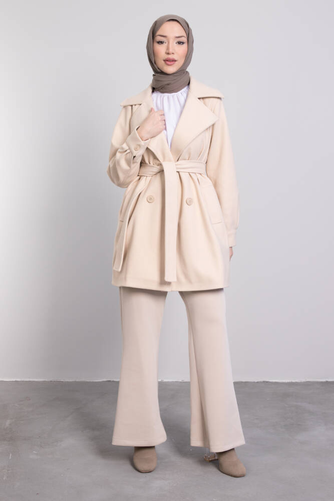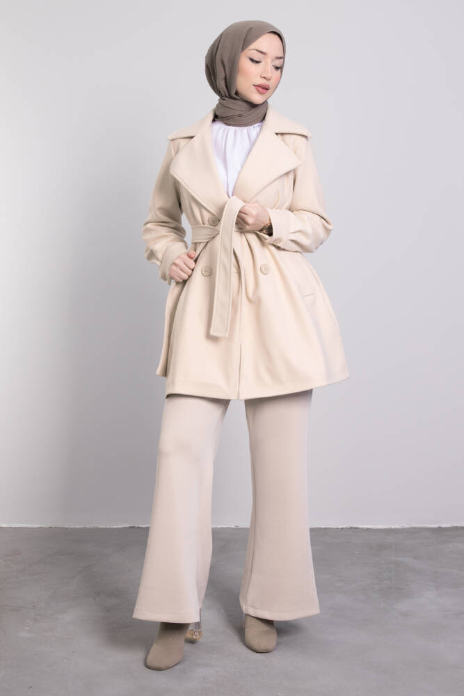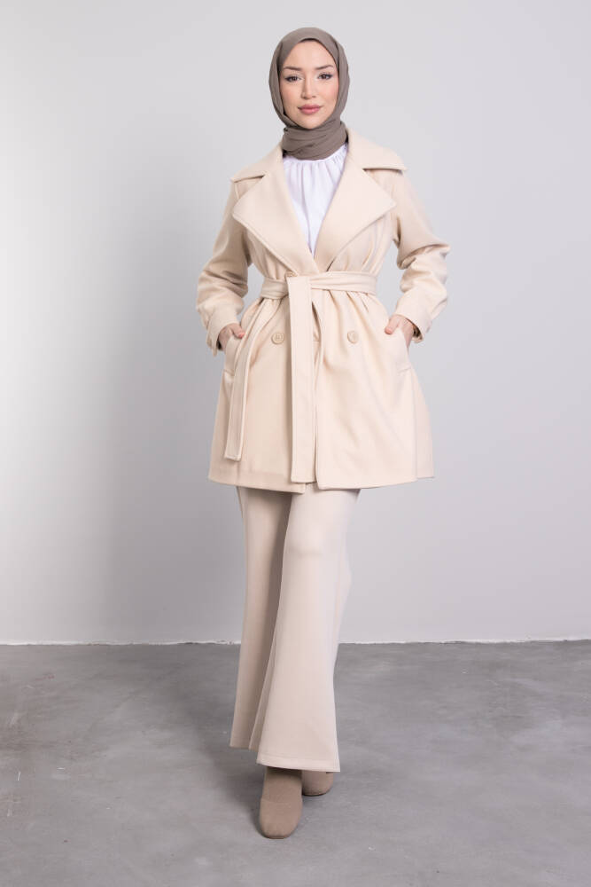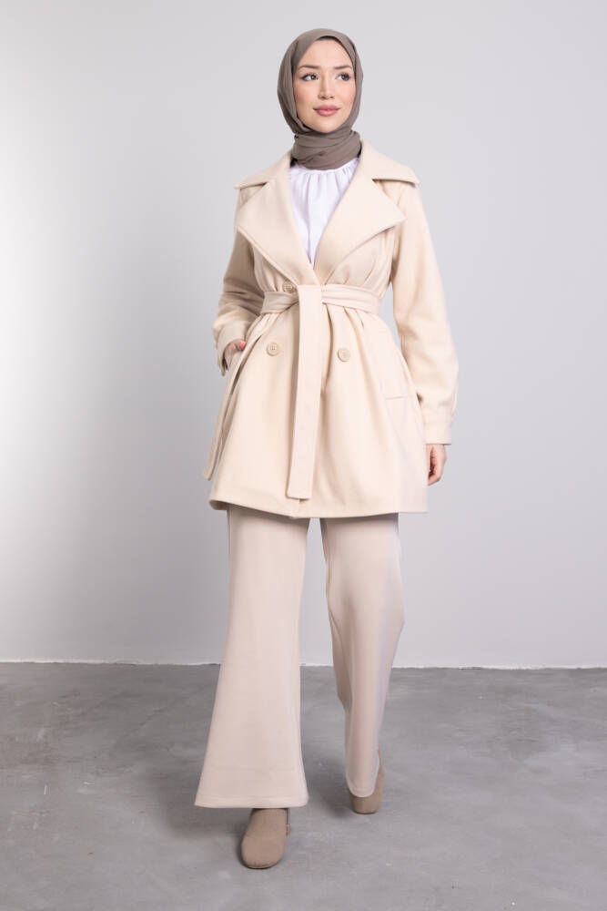Geniş Yaka Kısa Kaşe Kaban Krem