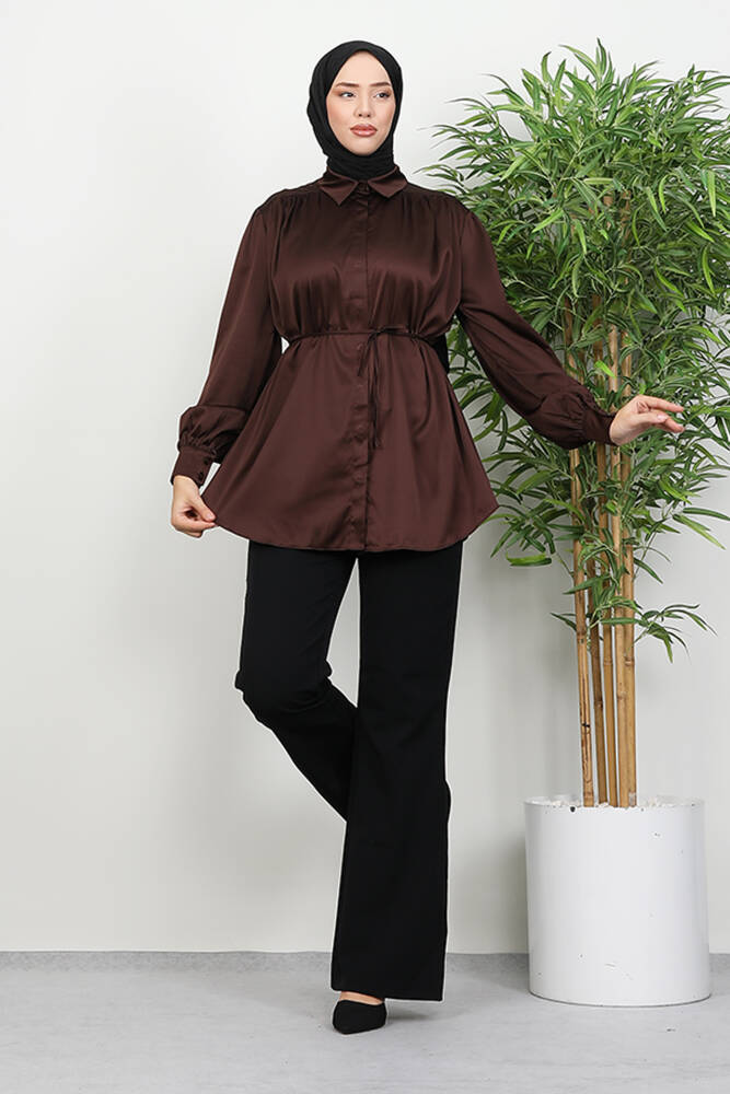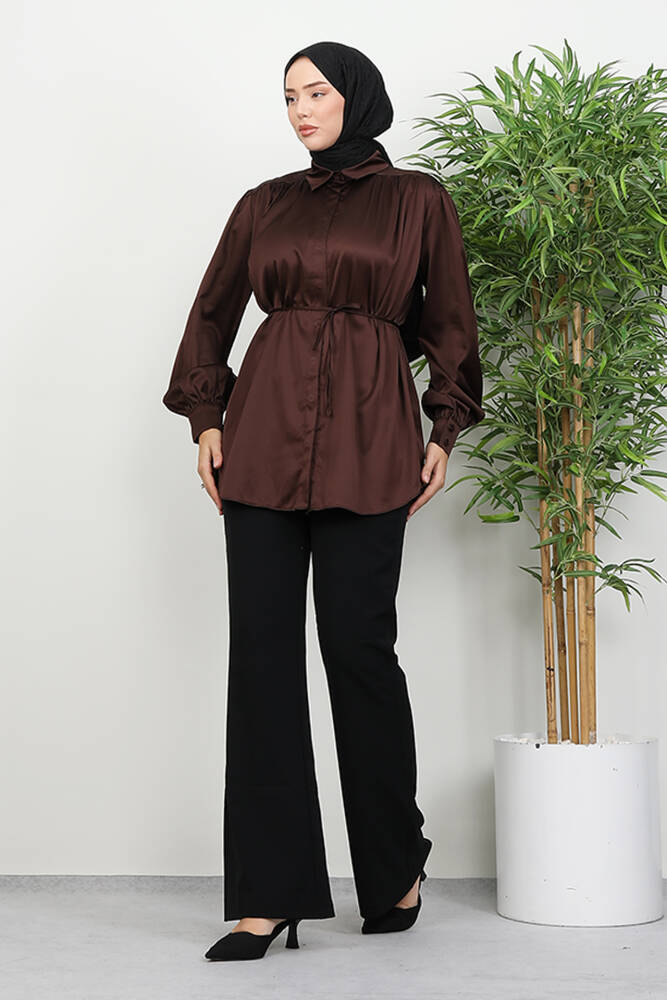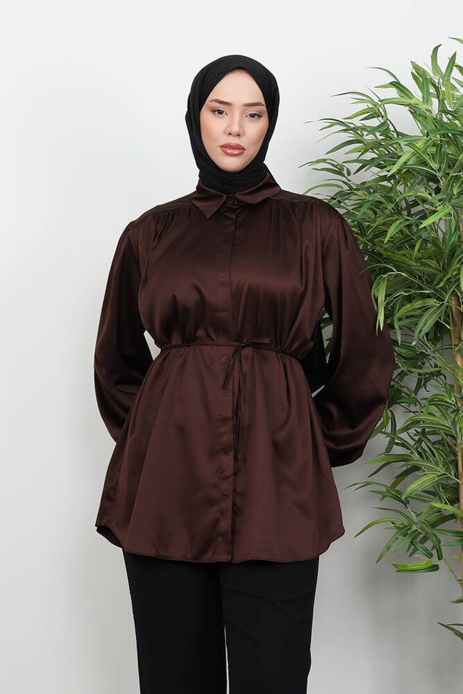 Gizli Düğmeli Saten Gömlek Acı Kahve