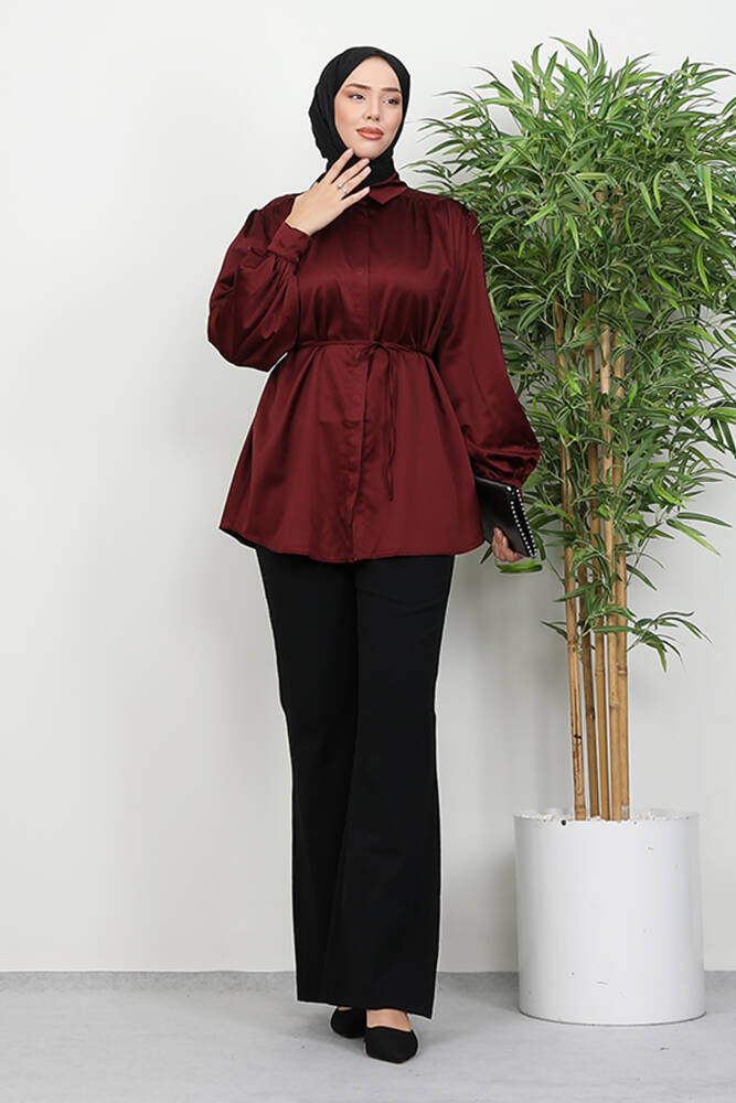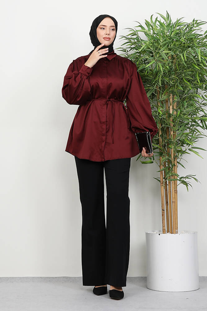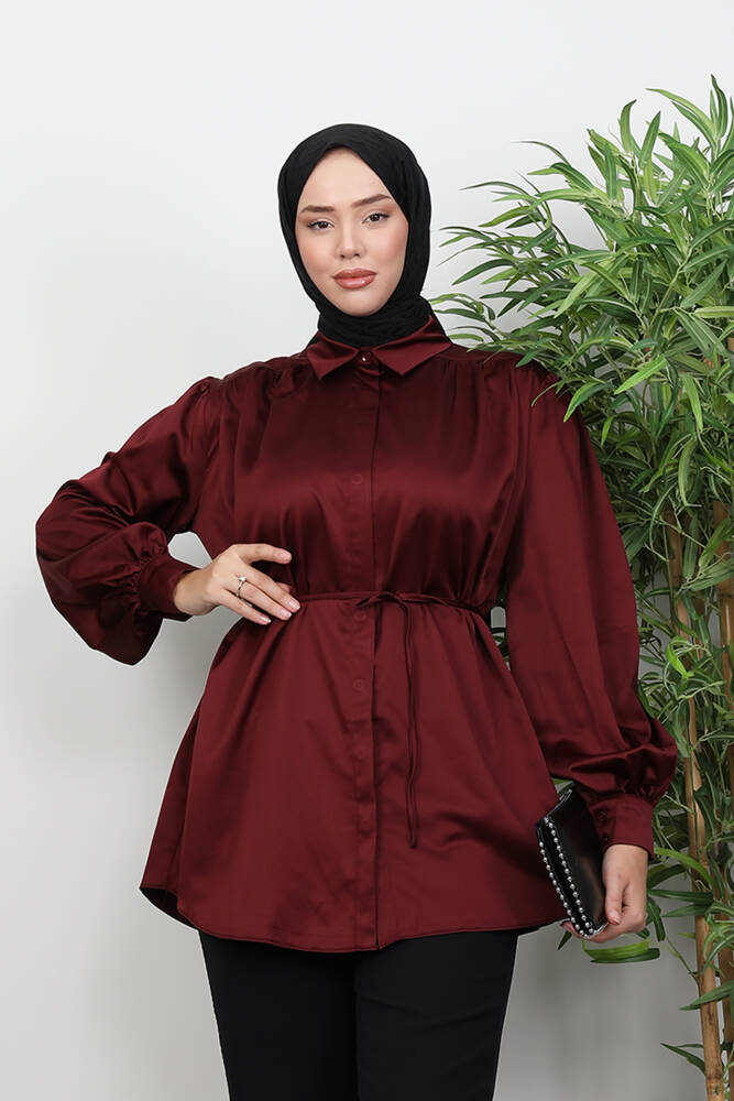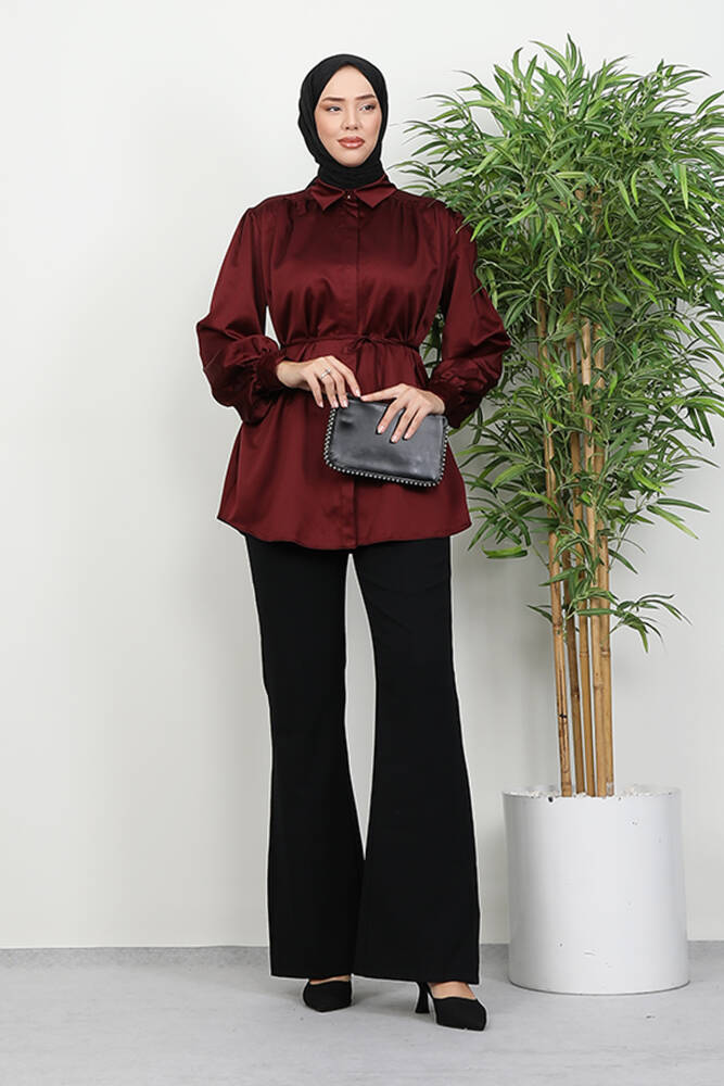 Gizli Düğmeli Saten Gömlek Bordo
