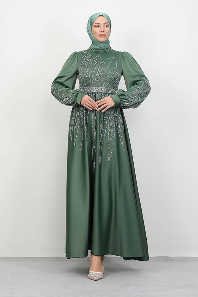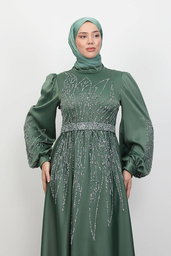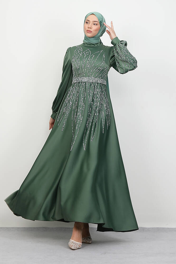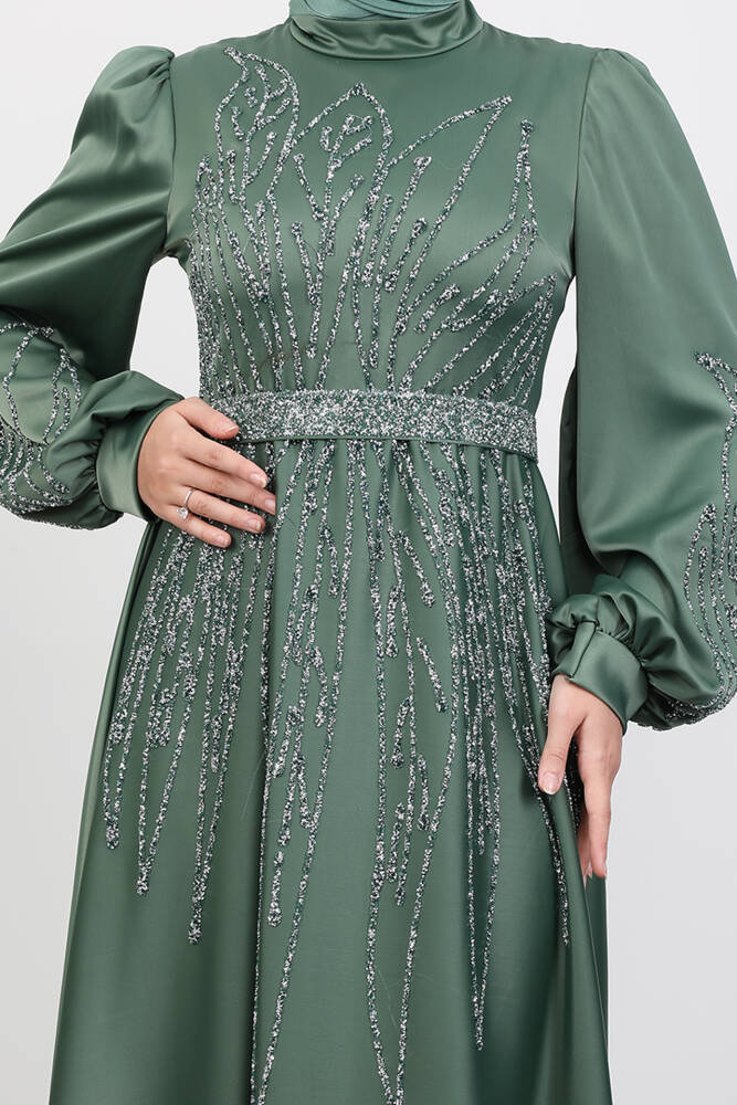 İkbal Taşlı Saten Abiye Soft Yeşil