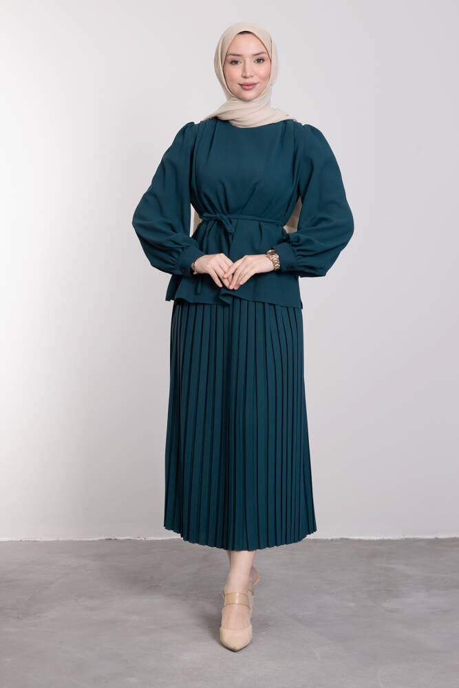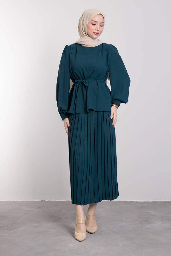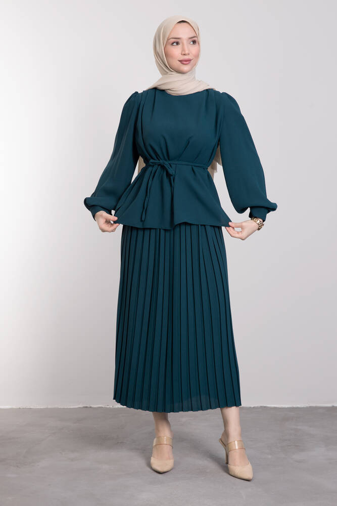 İnce Bağcıklı Piliseli Etekli Takım Koyu Petrol