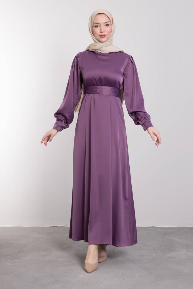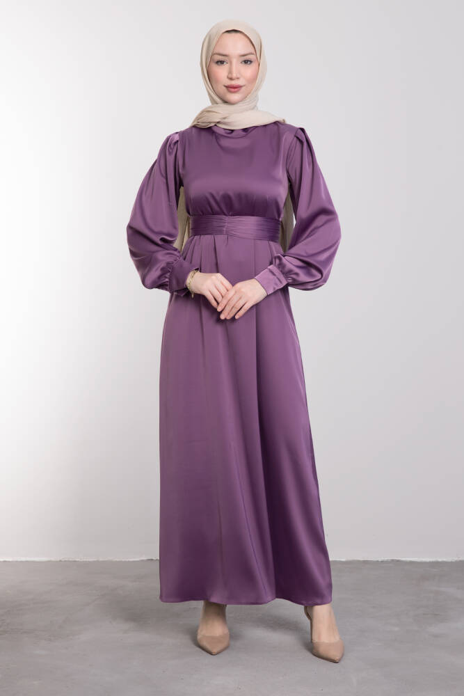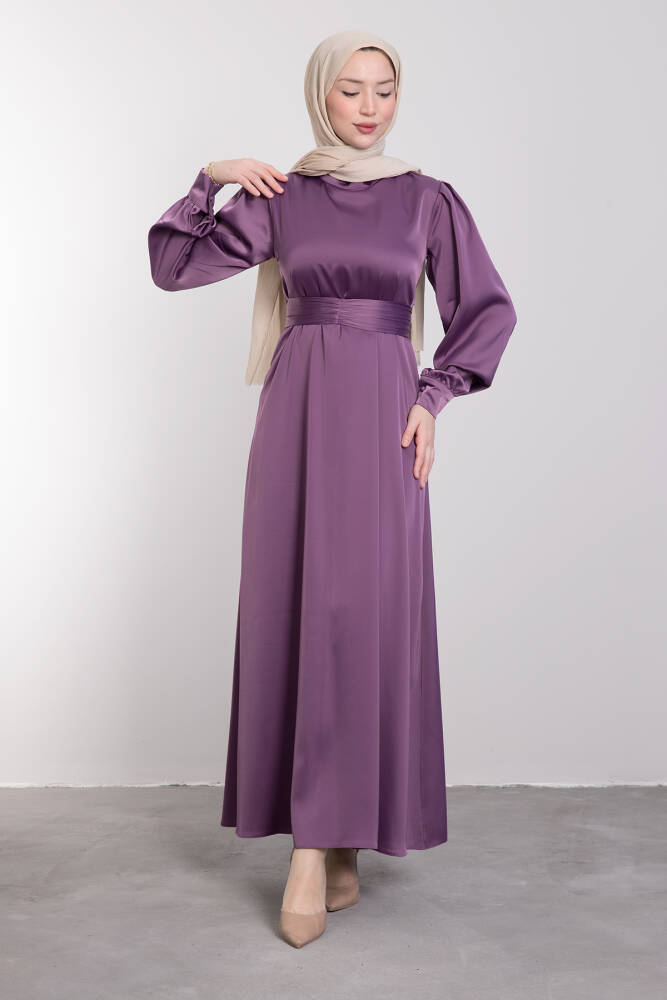 Kemerli Saten Elbise Koyu Lila