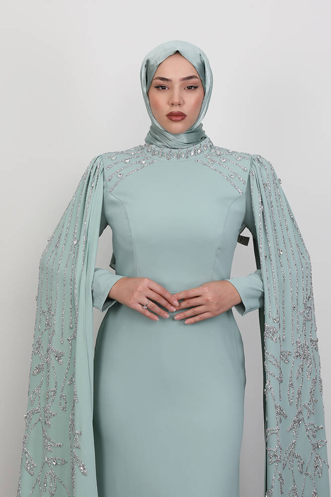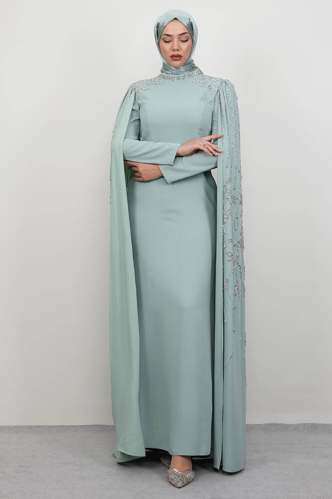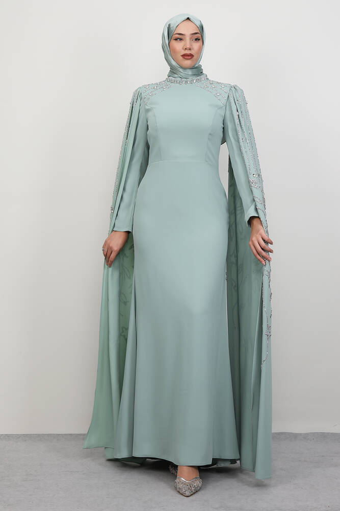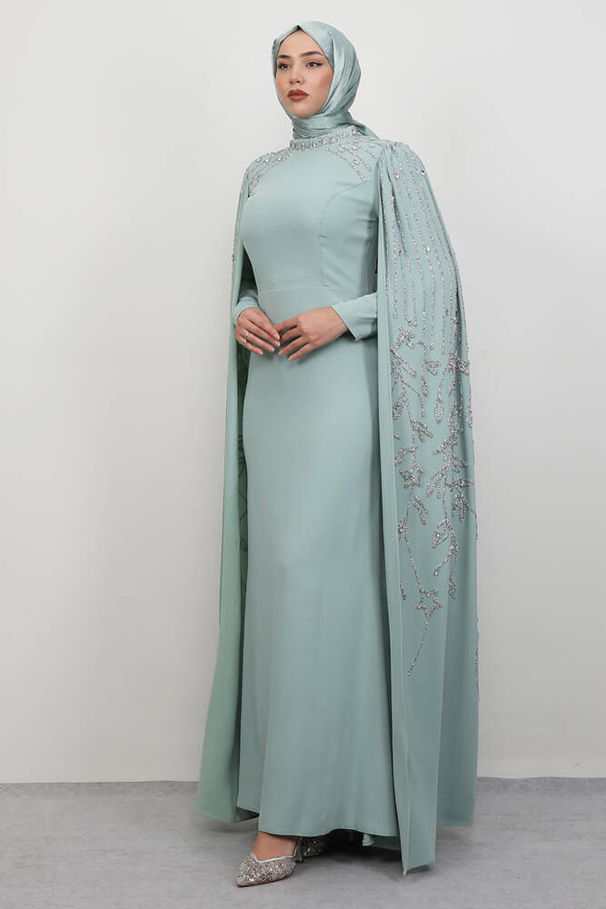 Kolları Taşlı Pelerinli Abiye Açık Mint