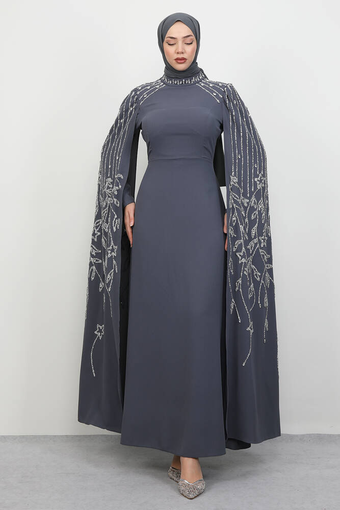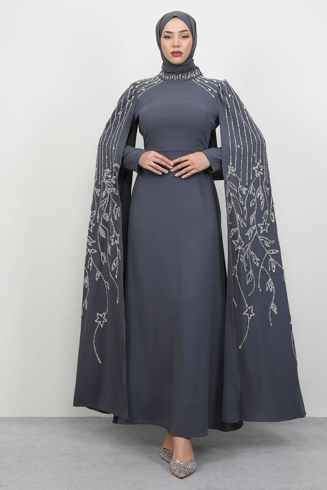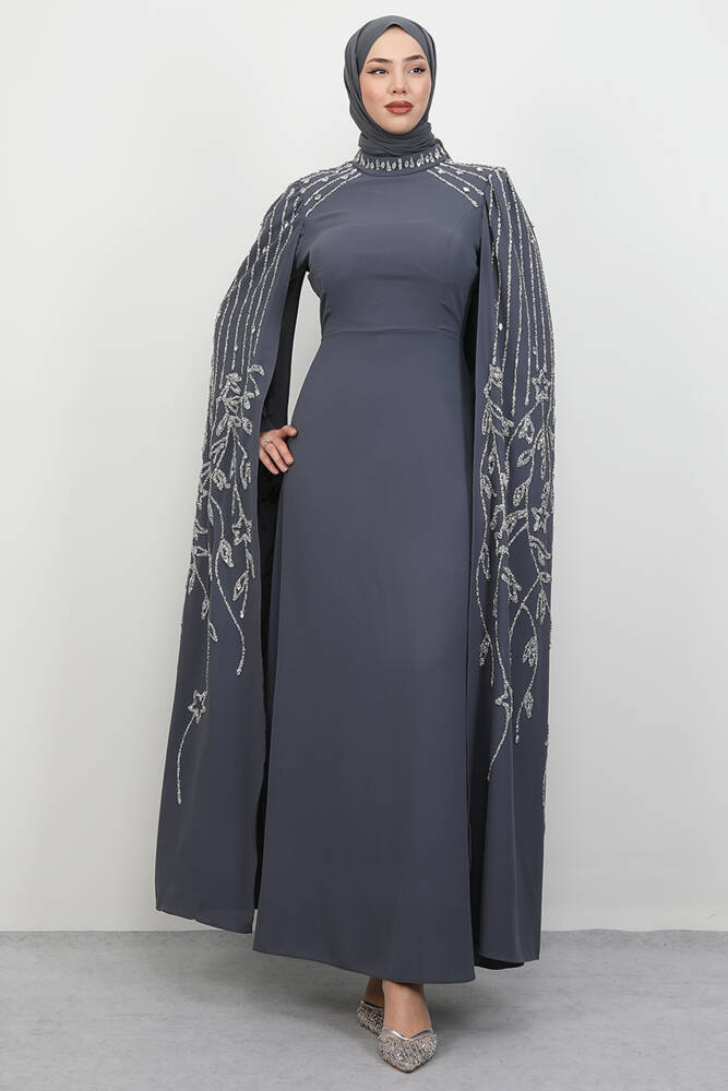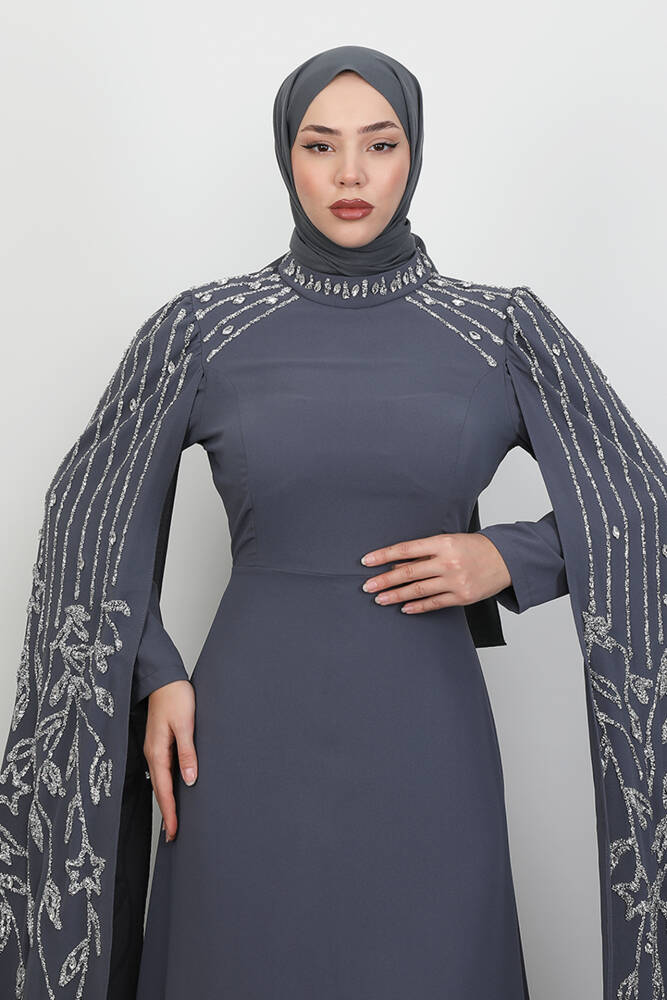 Kolları Taşlı Pelerinli Abiye Koyu Gri