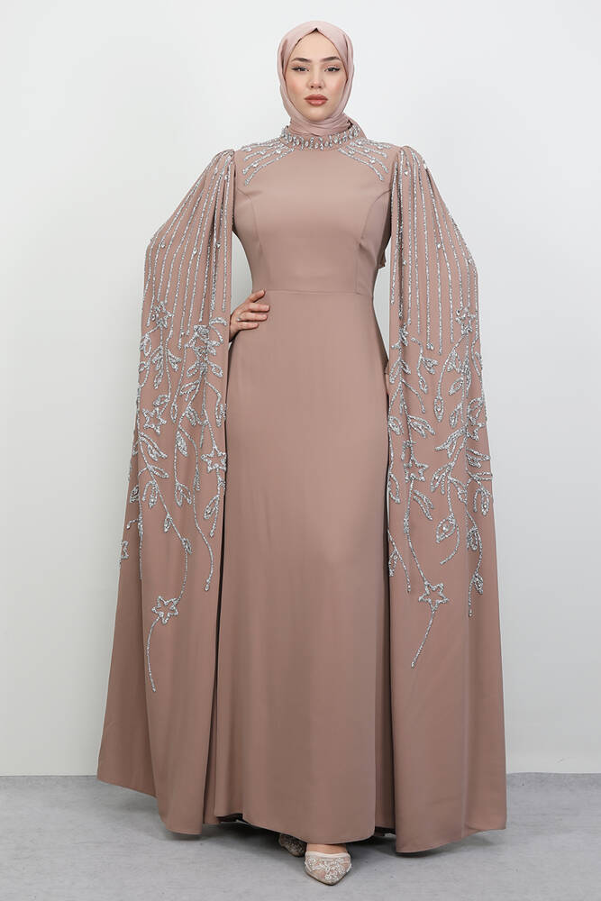 Kolları Taşlı Pelerinli Abiye Sütlükahve