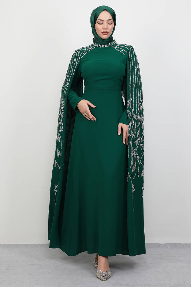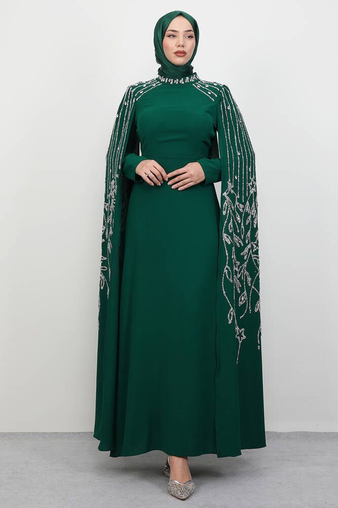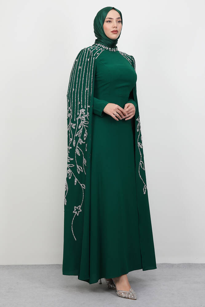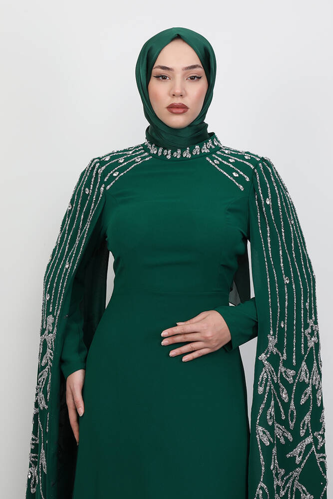 Kolları Taşlı Pelerinli Abiye Zümrüt
