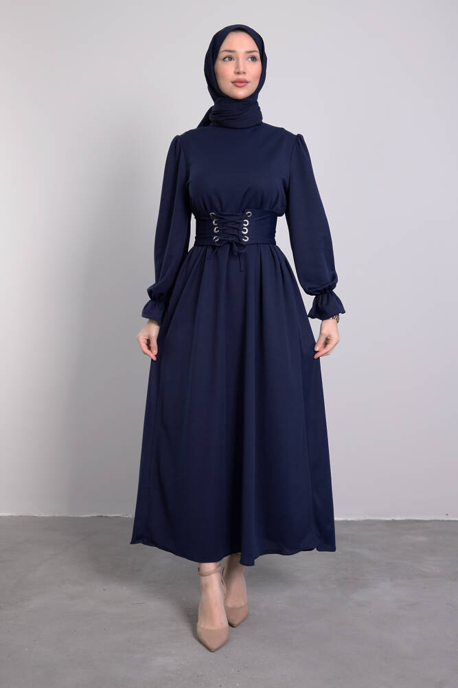 Kuş Gözlü Kuşaklı Elbise Lacivert
