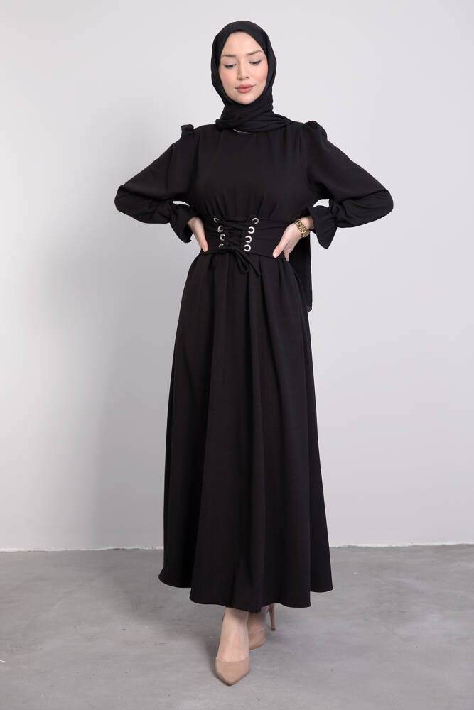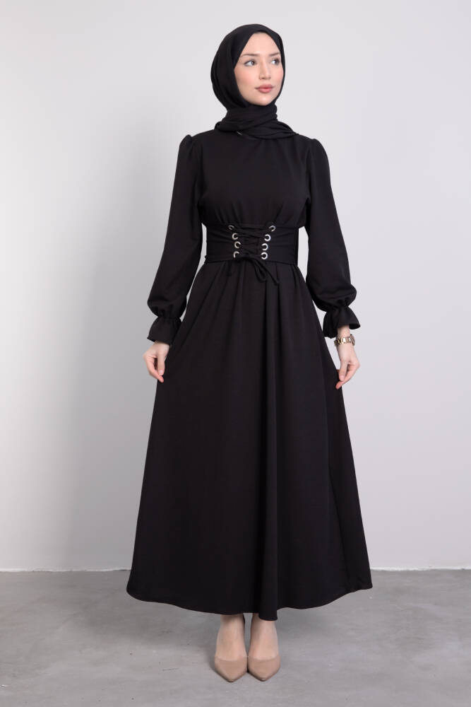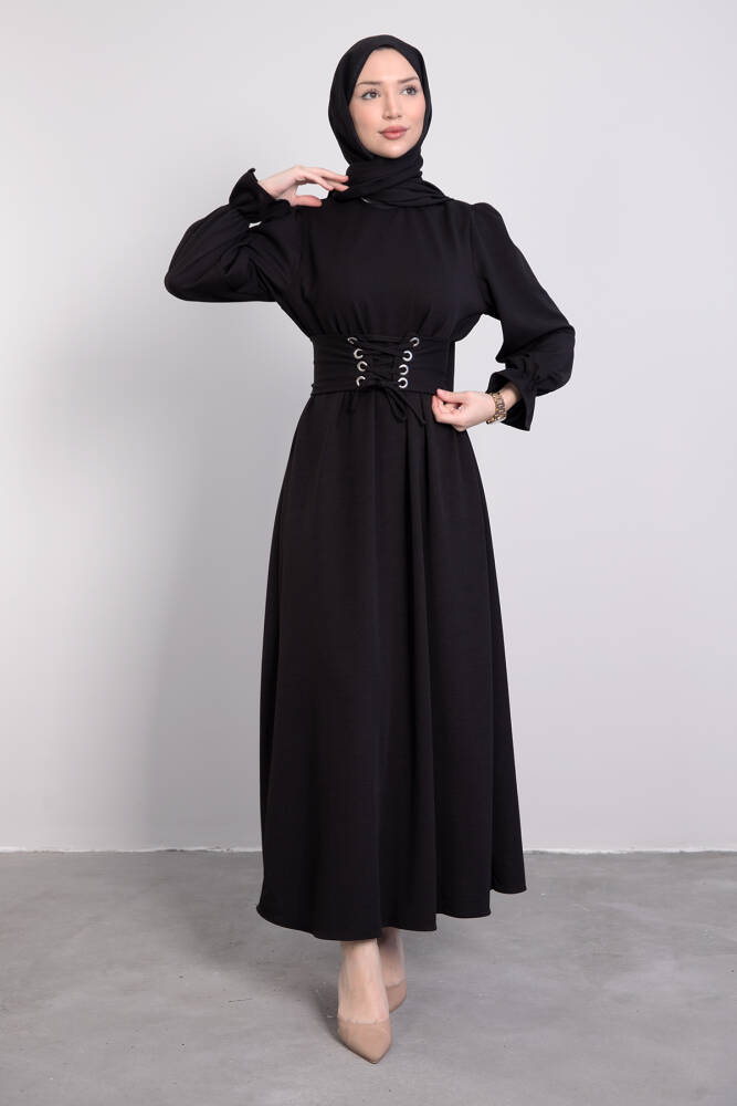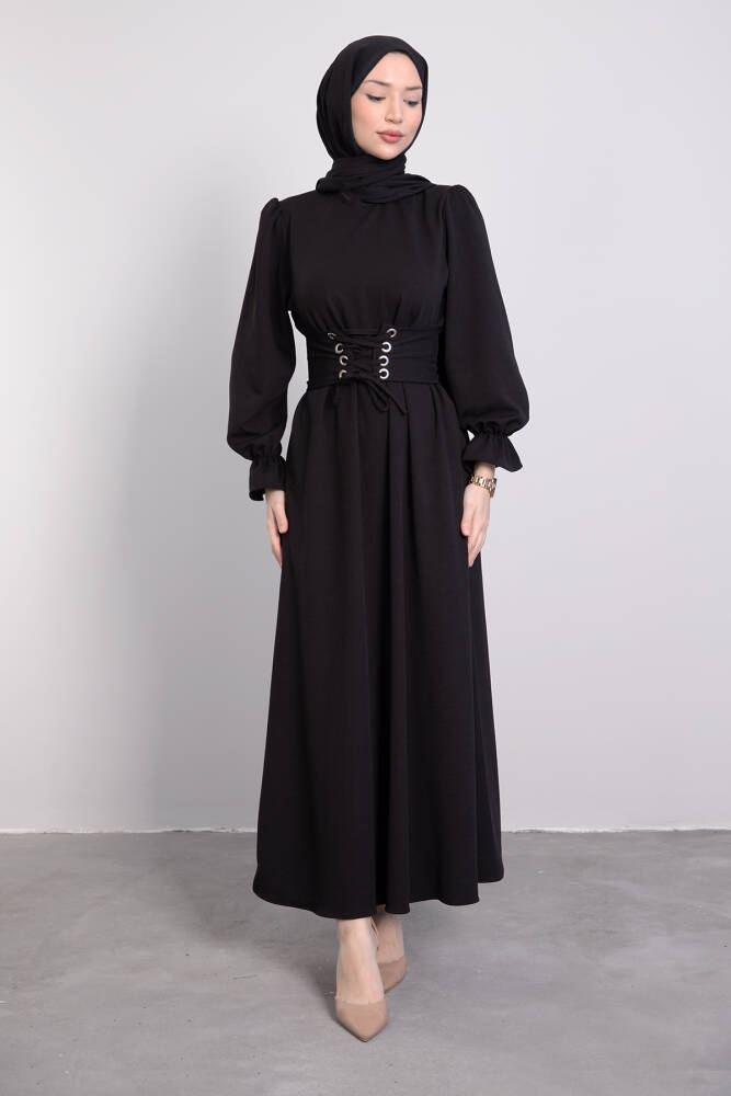Kuş Gözlü Kuşaklı Elbise Siyah