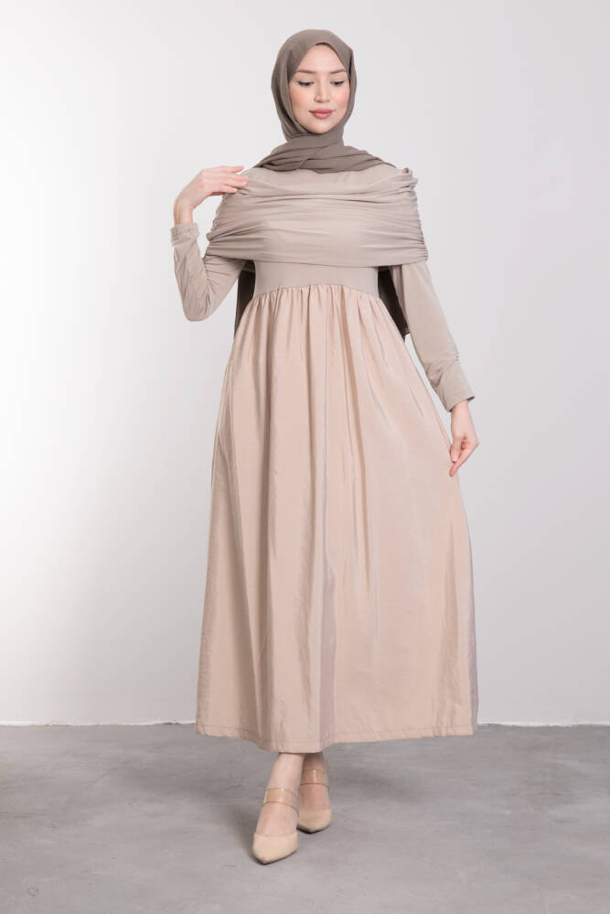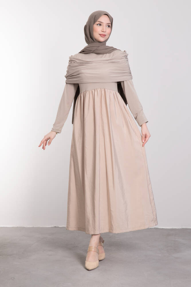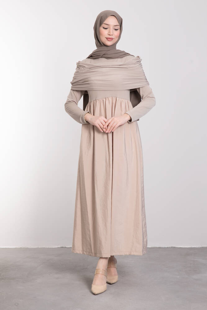 Omuzlarından Parça Büzgülü Elbise Vizon