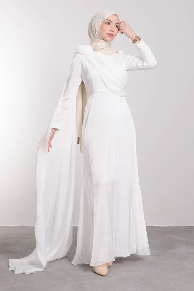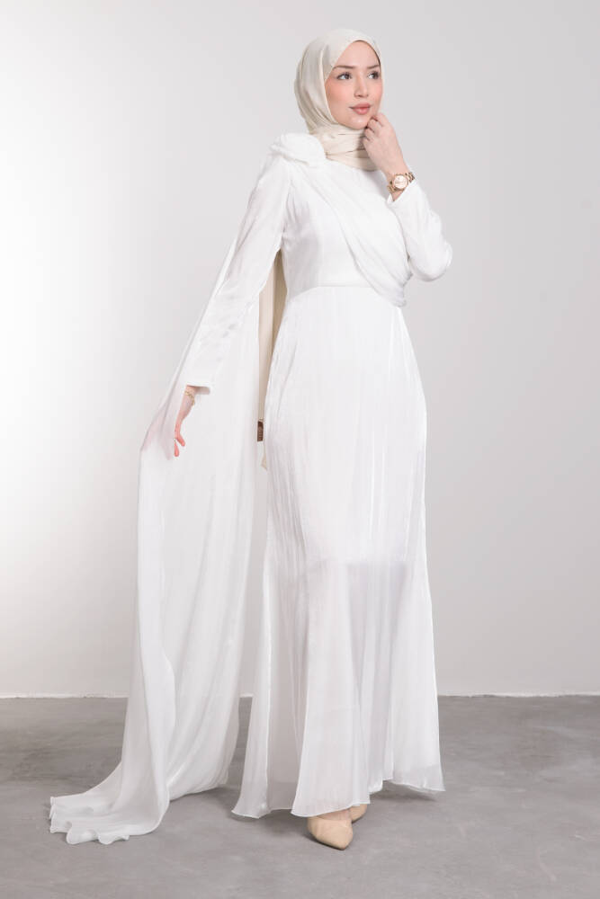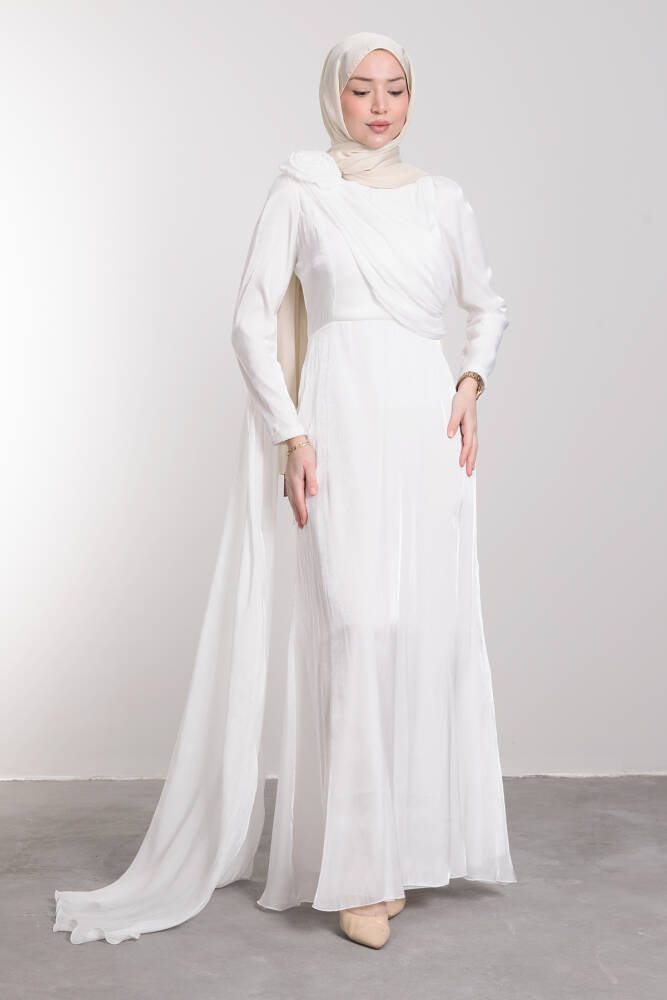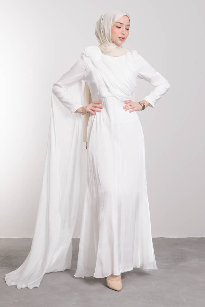 Omzu Çiçekli Tesettür Elbise Beyaz