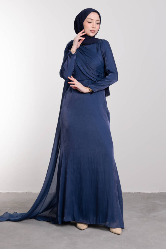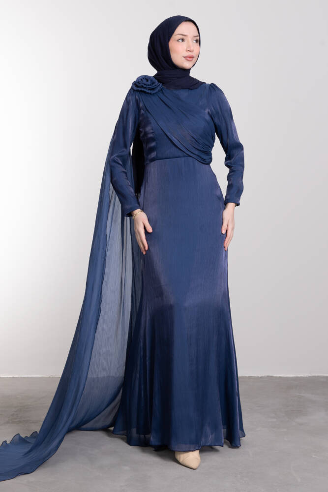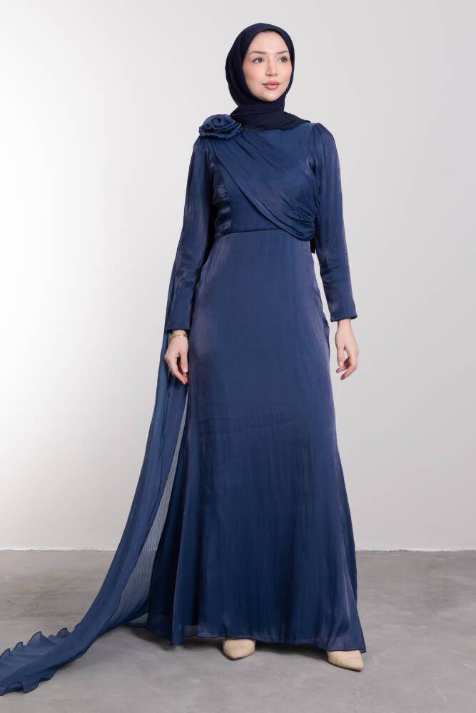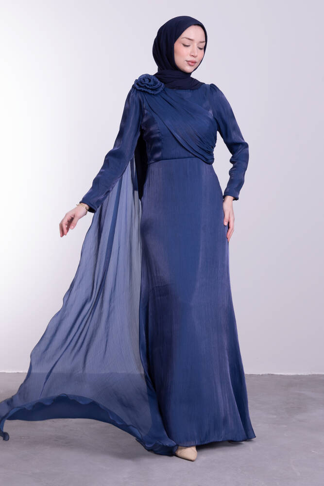 Omzu Çiçekli Tesettür Elbise Lacivert