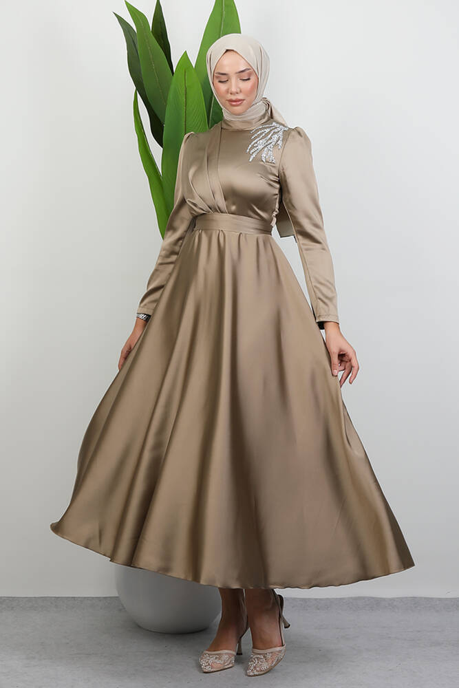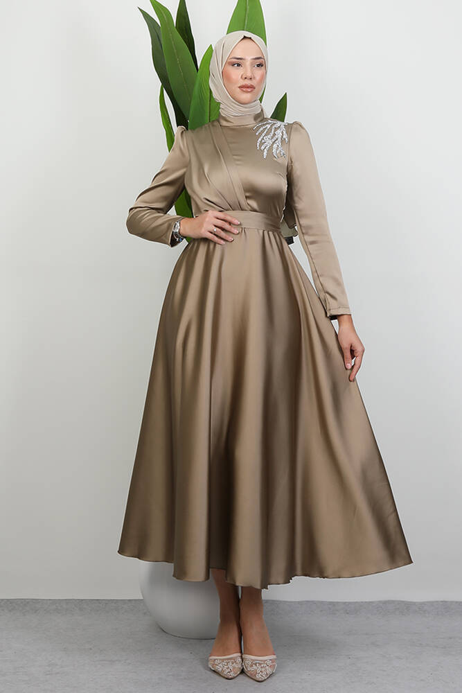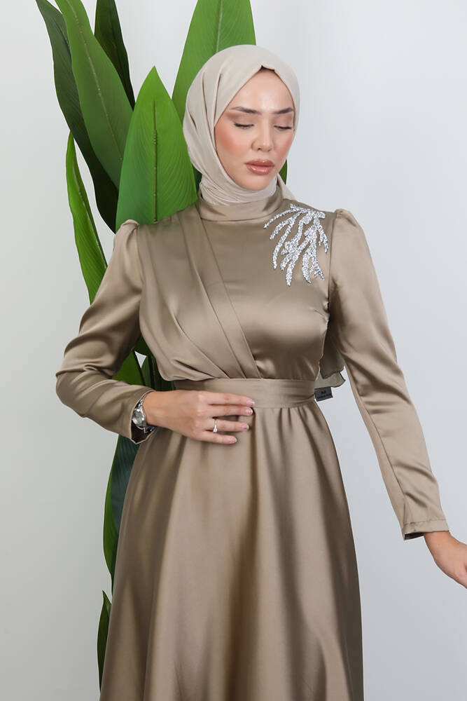 Omzu Taşlı Saten Abiye Açık Vizon