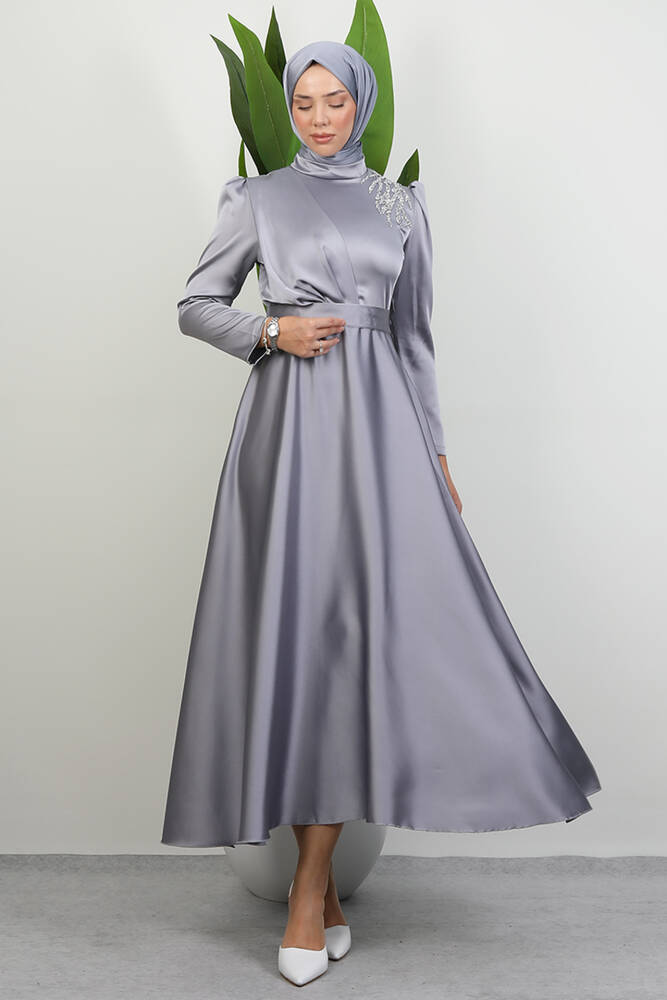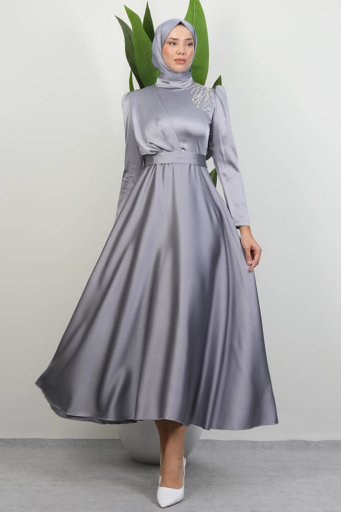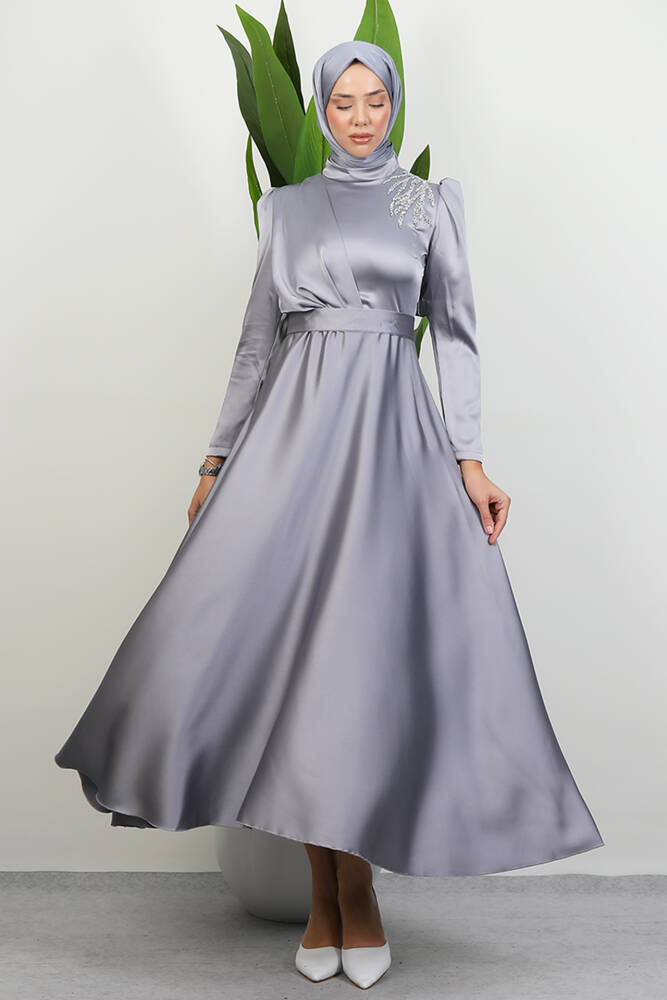 Omzu Taşlı Saten Abiye Gri