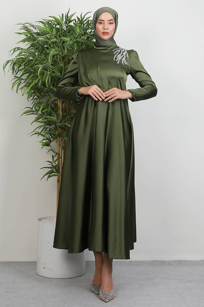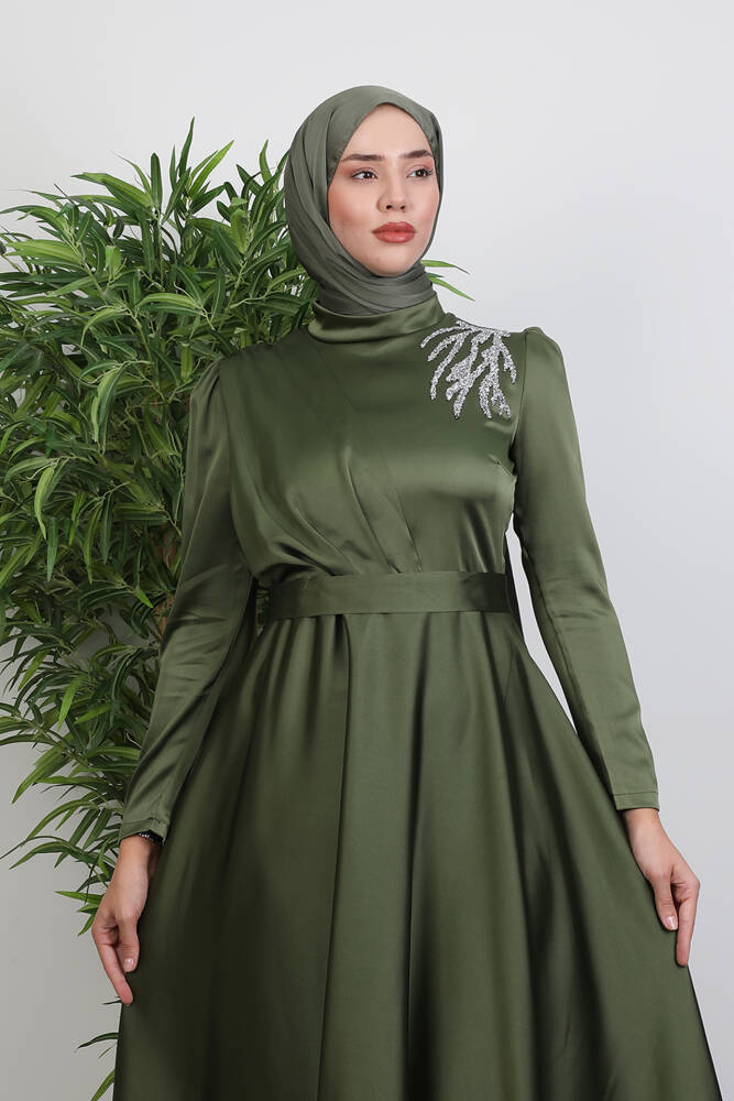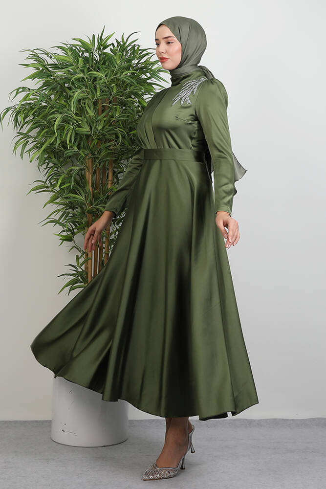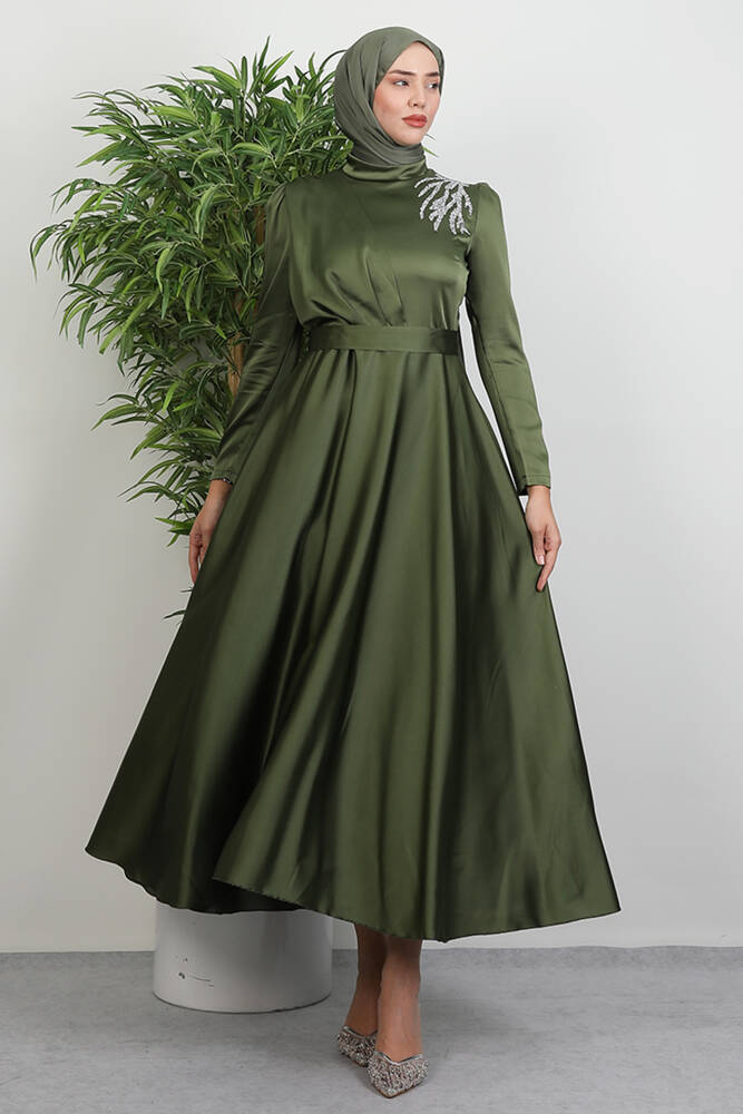Omzu Taşlı Saten Abiye Haki