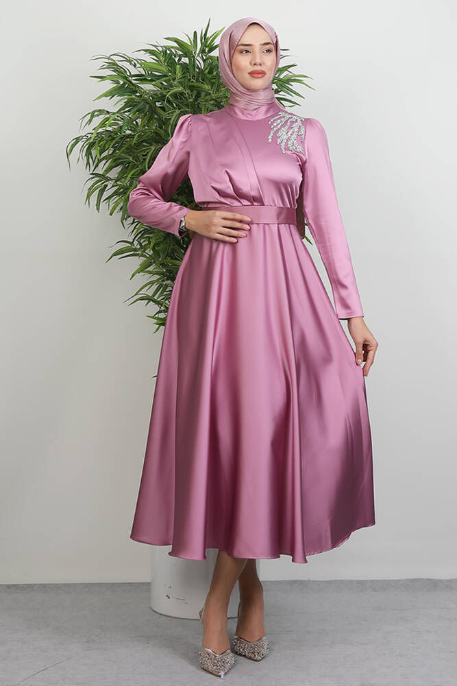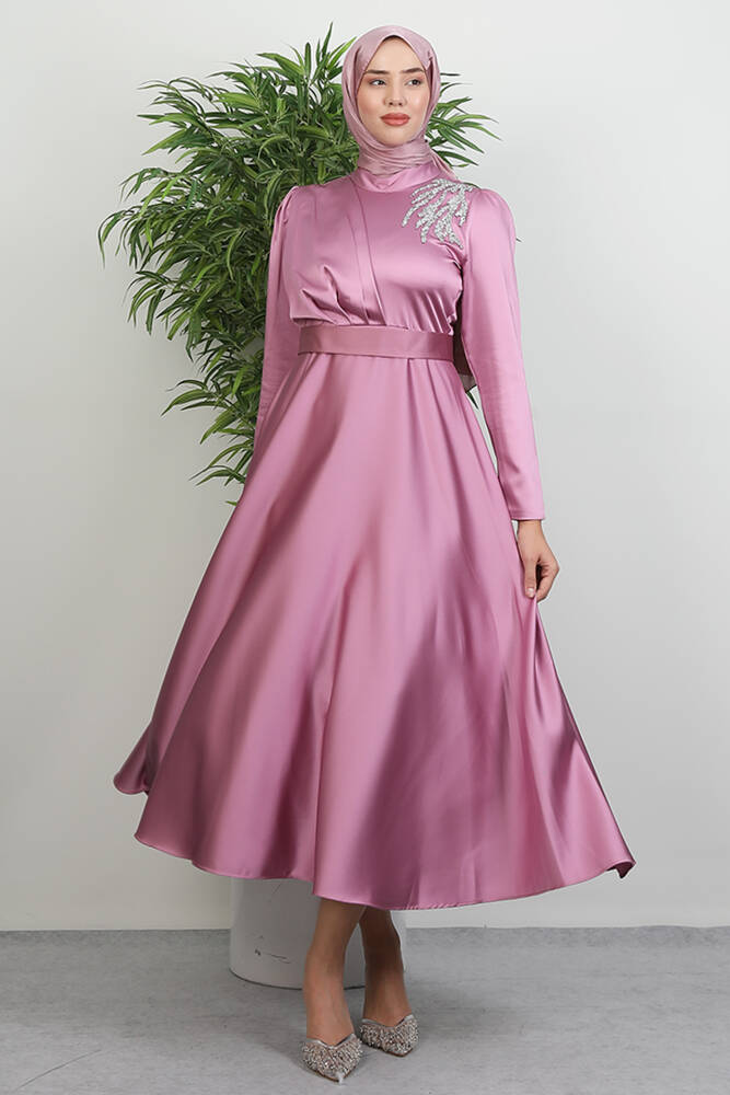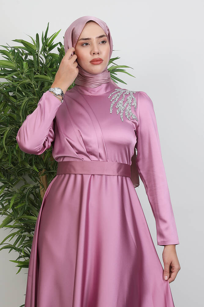Omzu Taşlı Saten Abiye Koyu Pembe