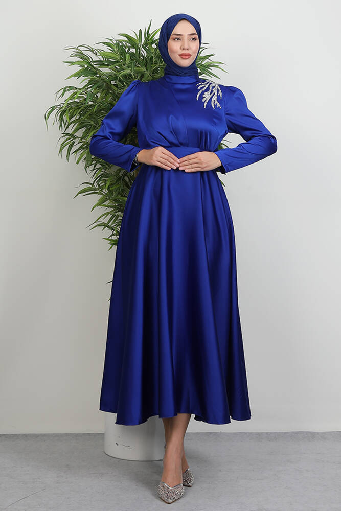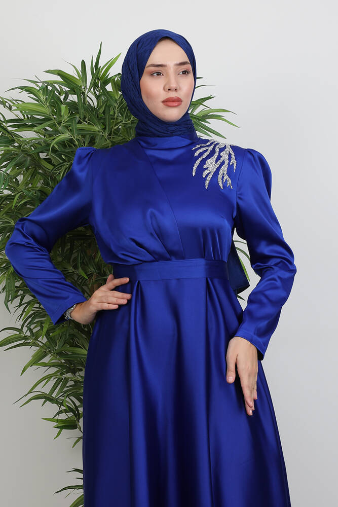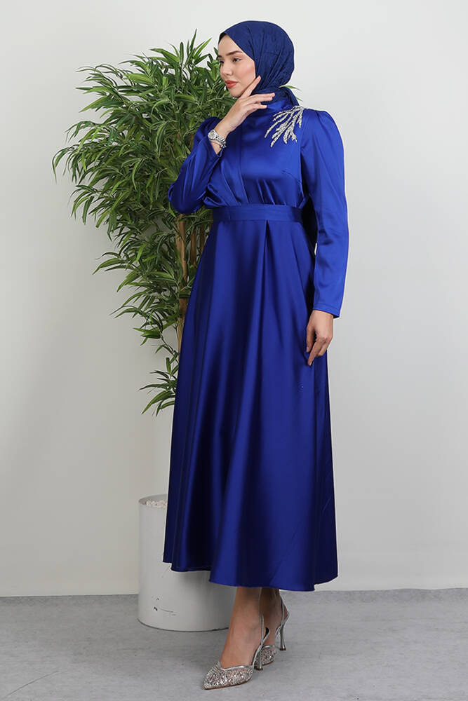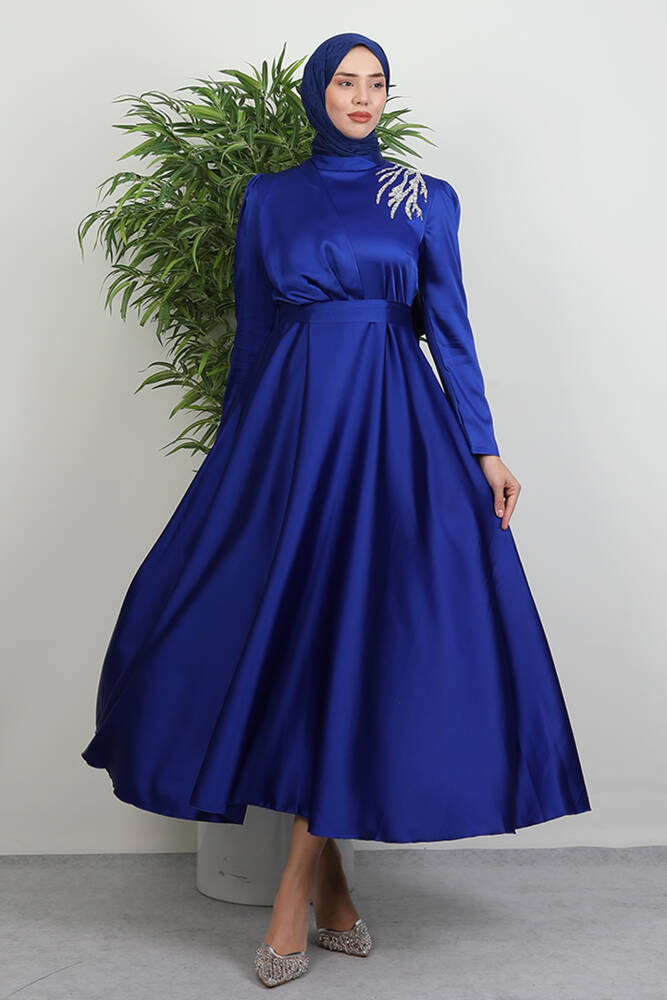 Omzu Taşlı Saten Abiye Saks