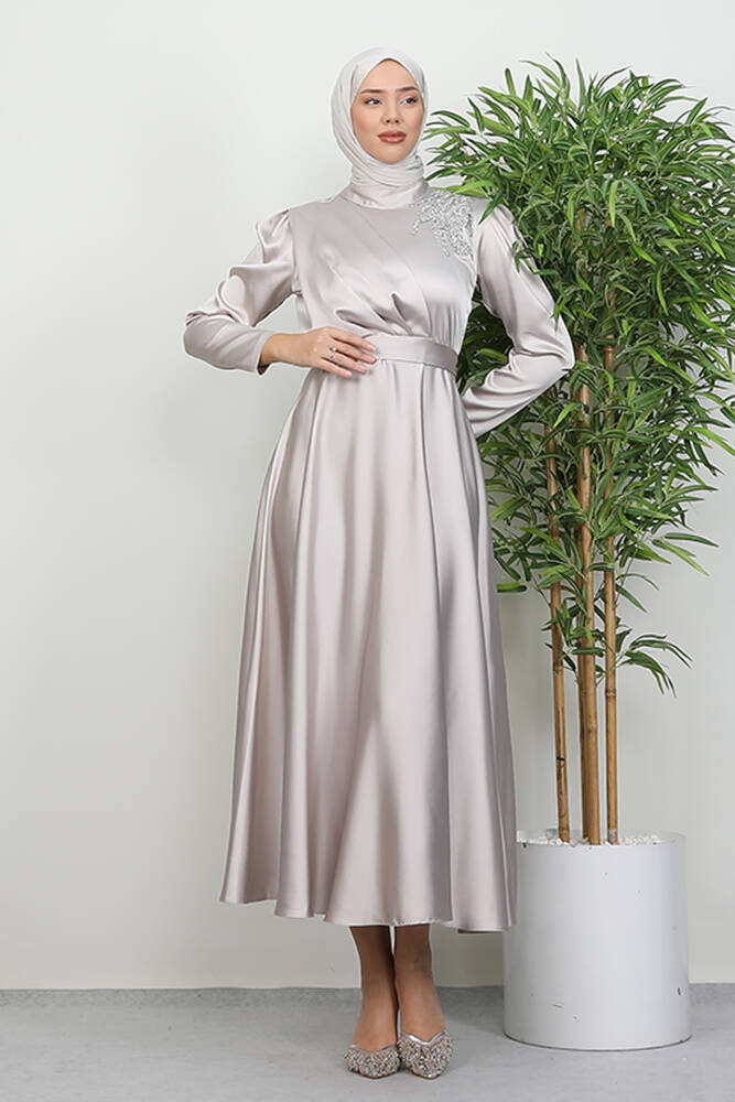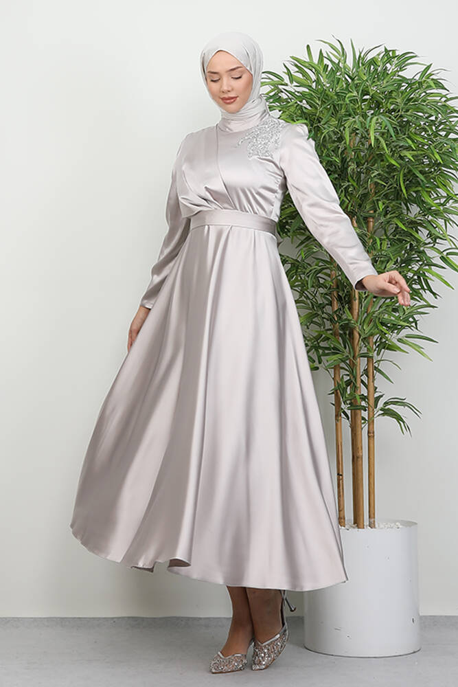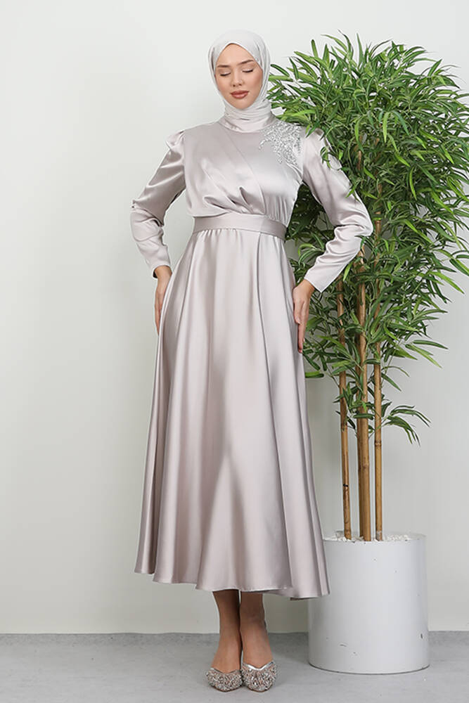 Omzu Taşlı Saten Abiye Taş