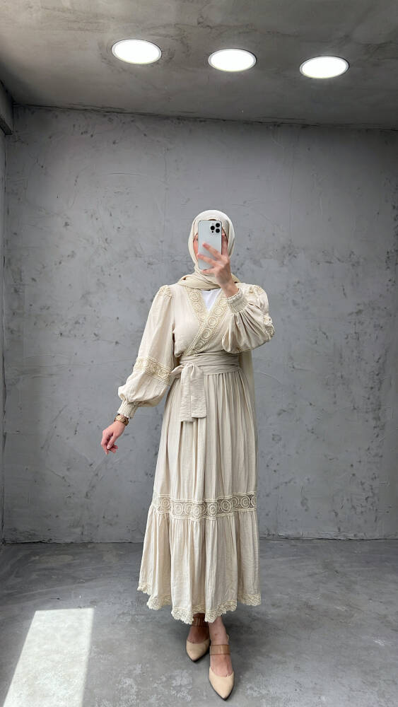 Pamuklu Güpür Detaylı Kuşaklı İkili Takım Krem
