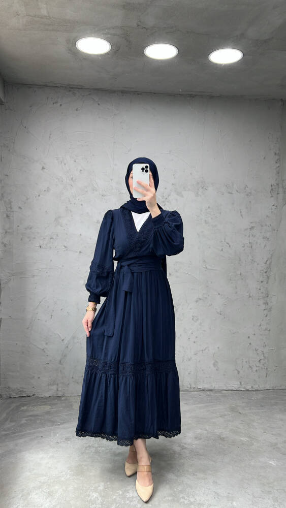 Pamuklu Güpür Detaylı Kuşaklı İkili Takım Lacivert