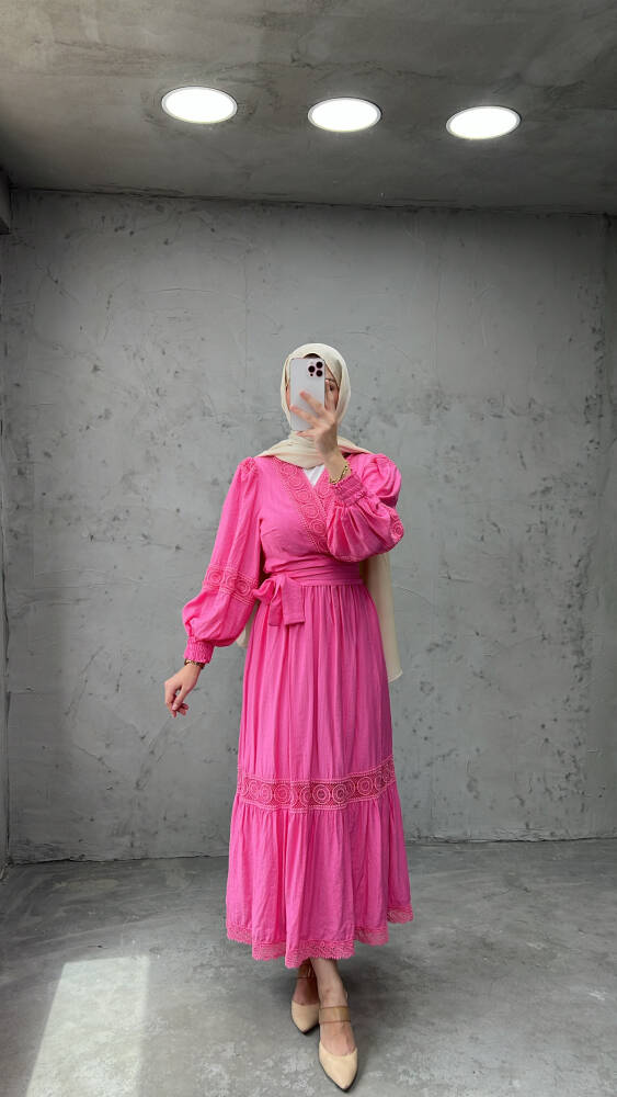 Pamuklu Güpür Detaylı Kuşaklı İkili Takım Pembe