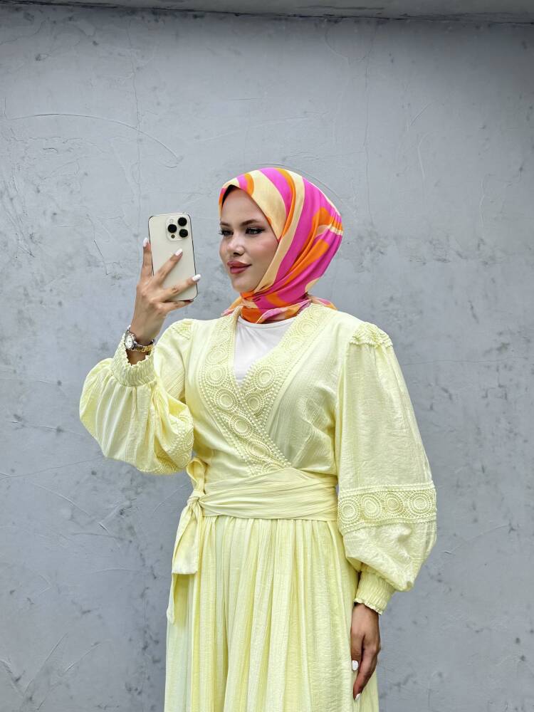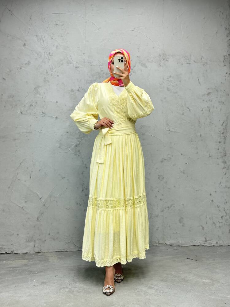 Pamuklu Güpür Detaylı Kuşaklı İkili Takım Sarı