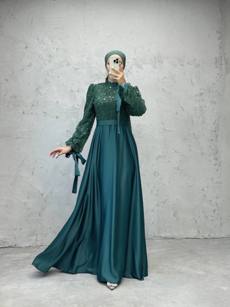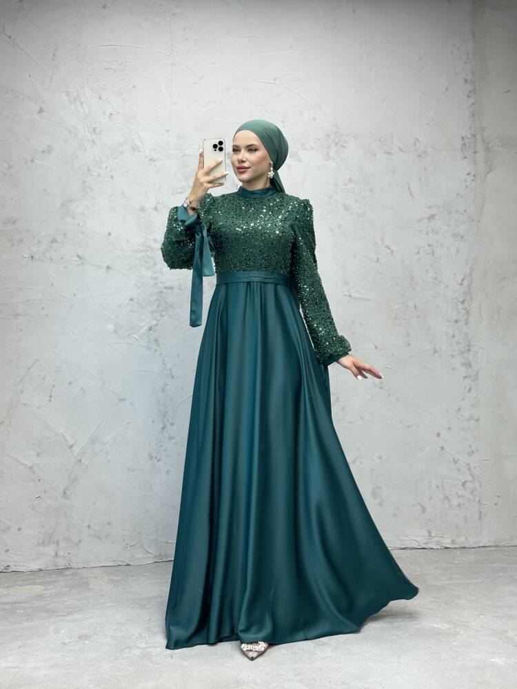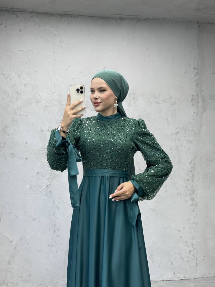 Pul Payet Detay Saten Abiye Zümrüt