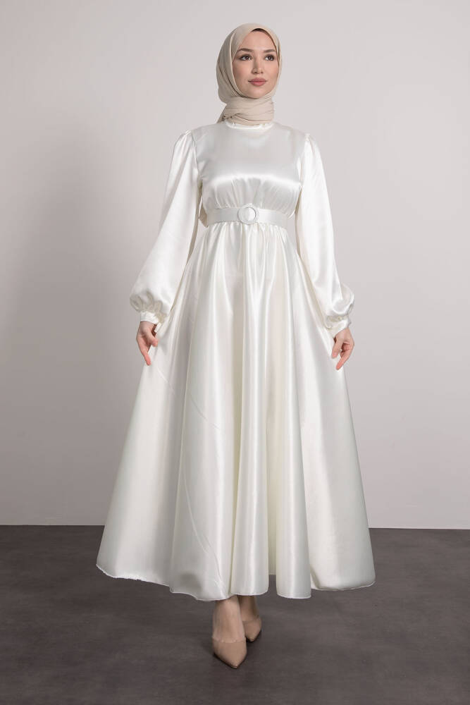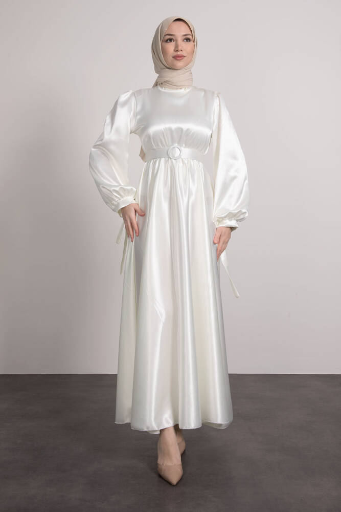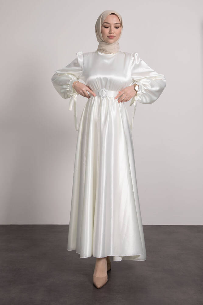 Saten Kemerli Elbise Beyaz
