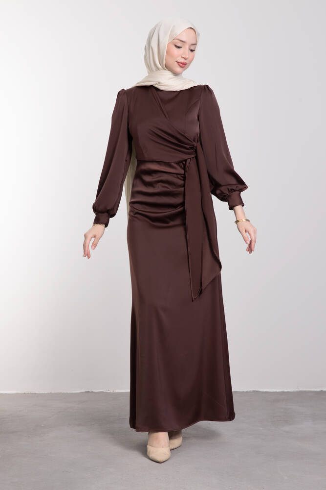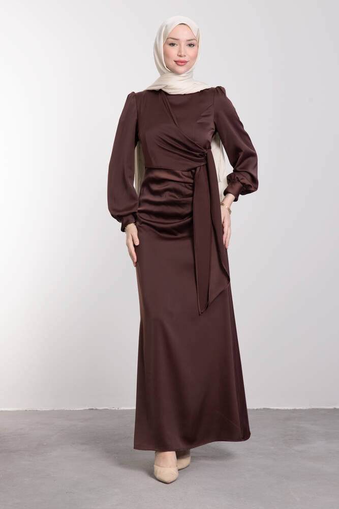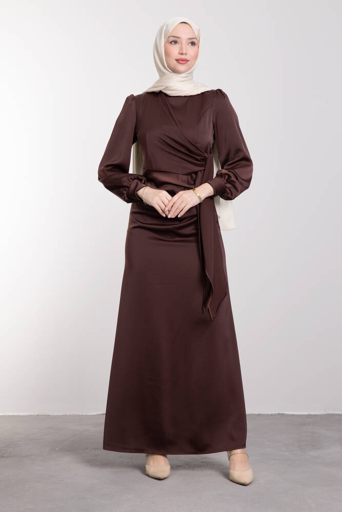 Saten Yan Kuşaklı Elbise Acı Kahve