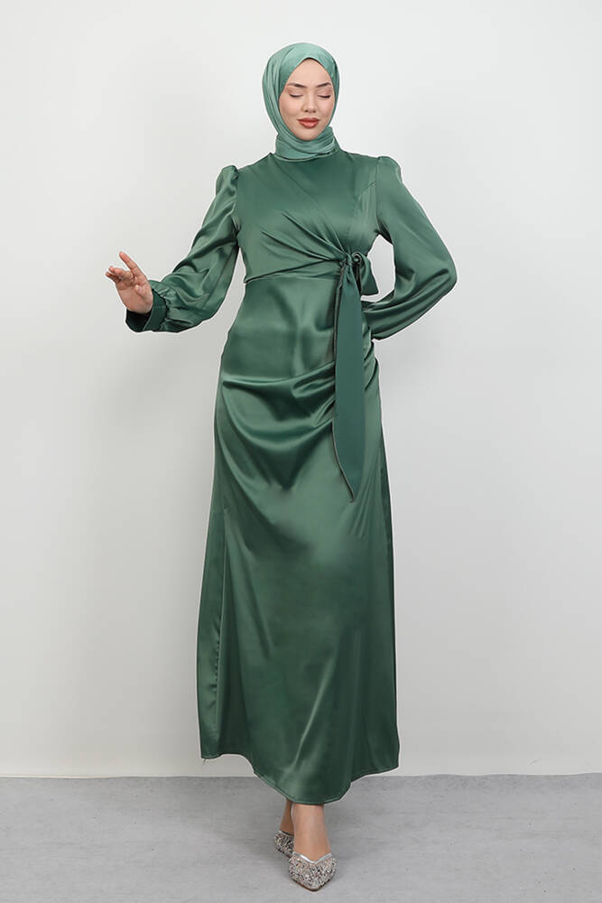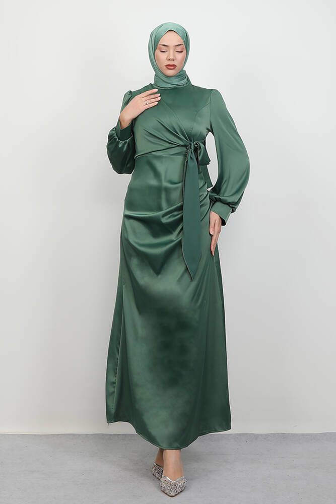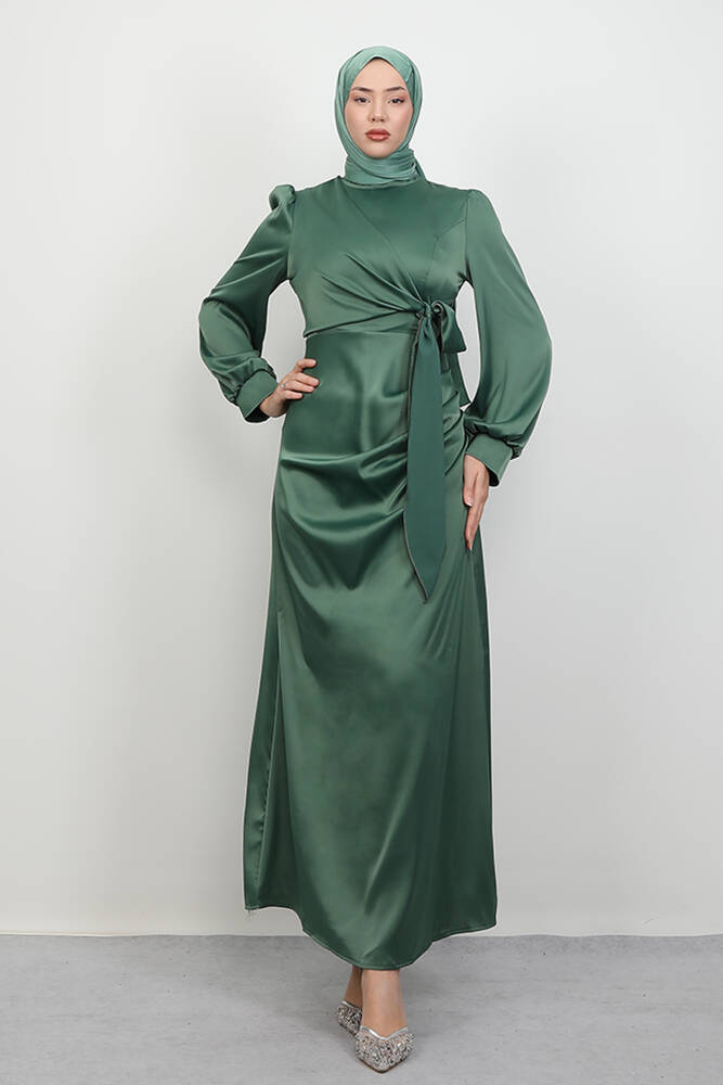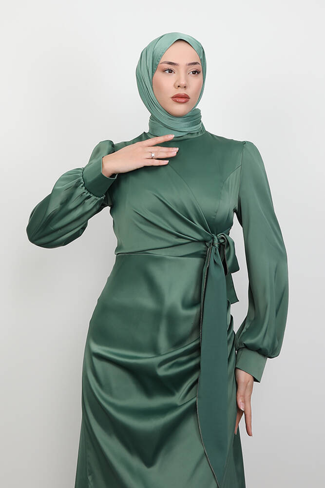 Saten Yan Kuşaklı Elbise Açık Yeşil