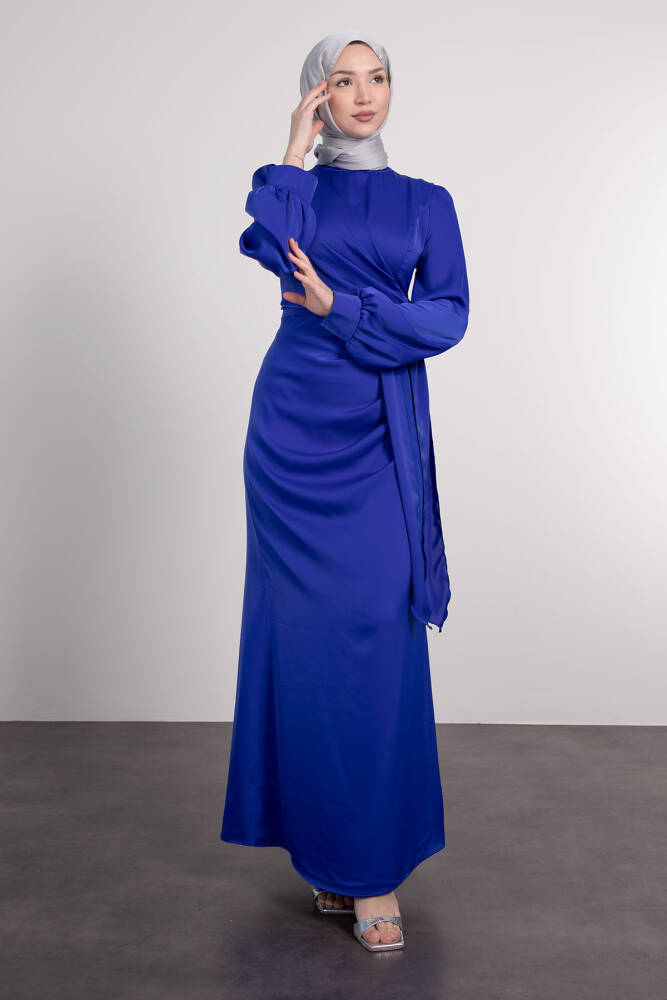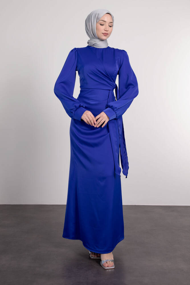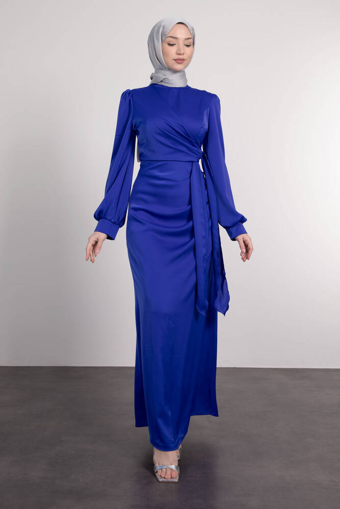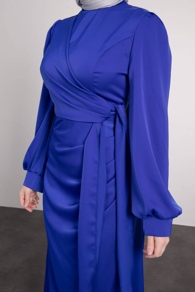 Saten Yan Kuşaklı Elbise Gece Mavi