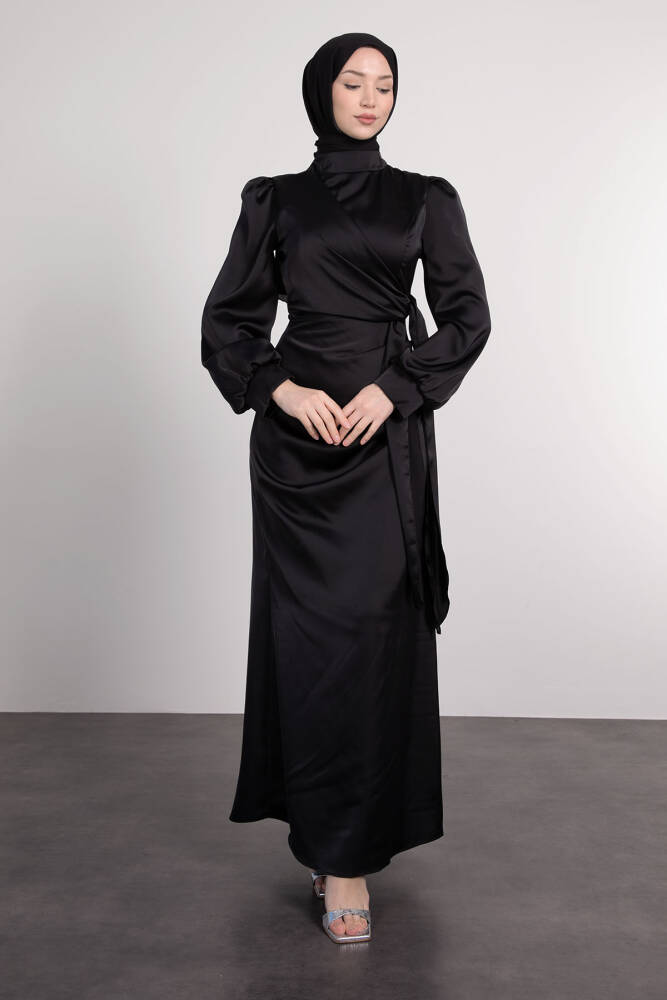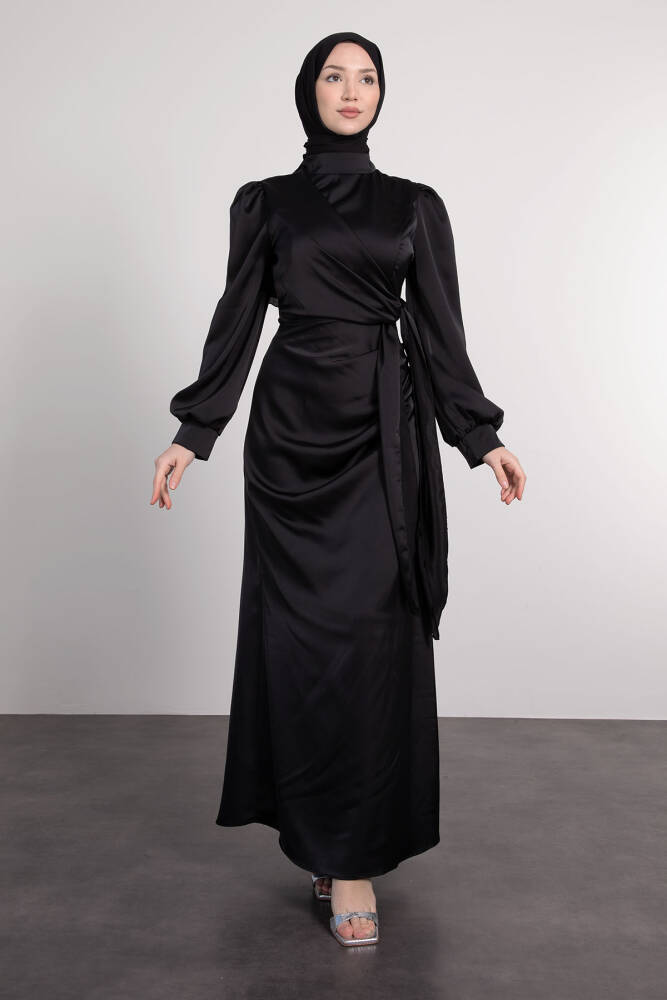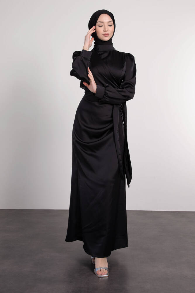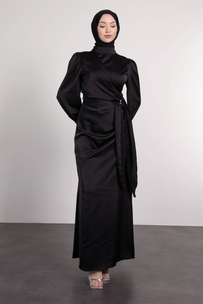 Saten Yan Kuşaklı Elbise Siyah