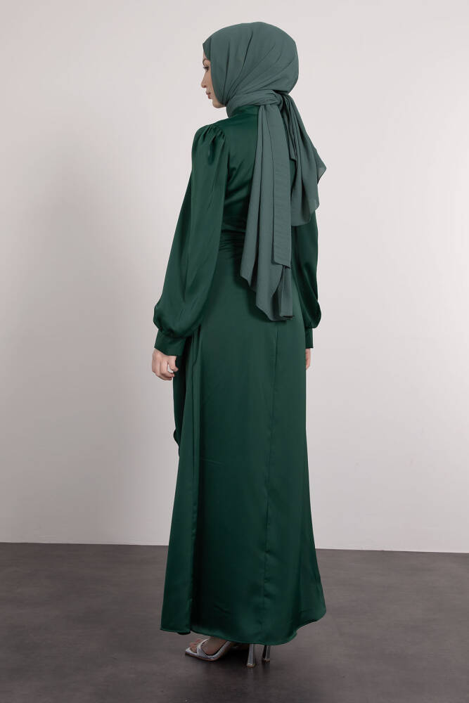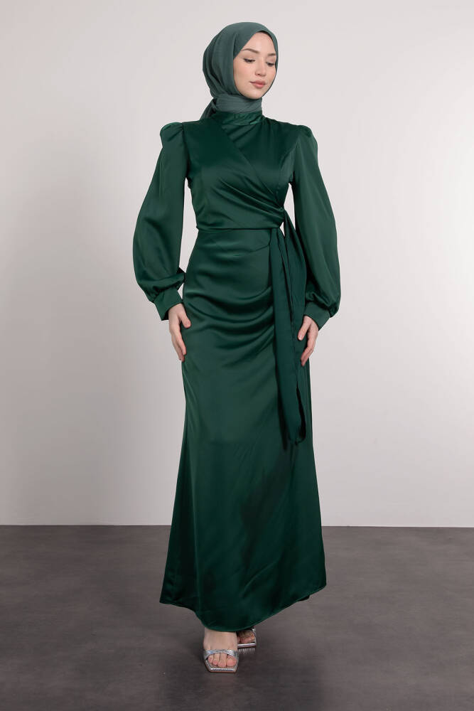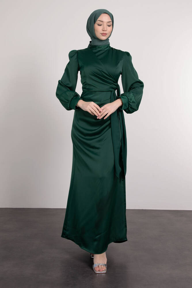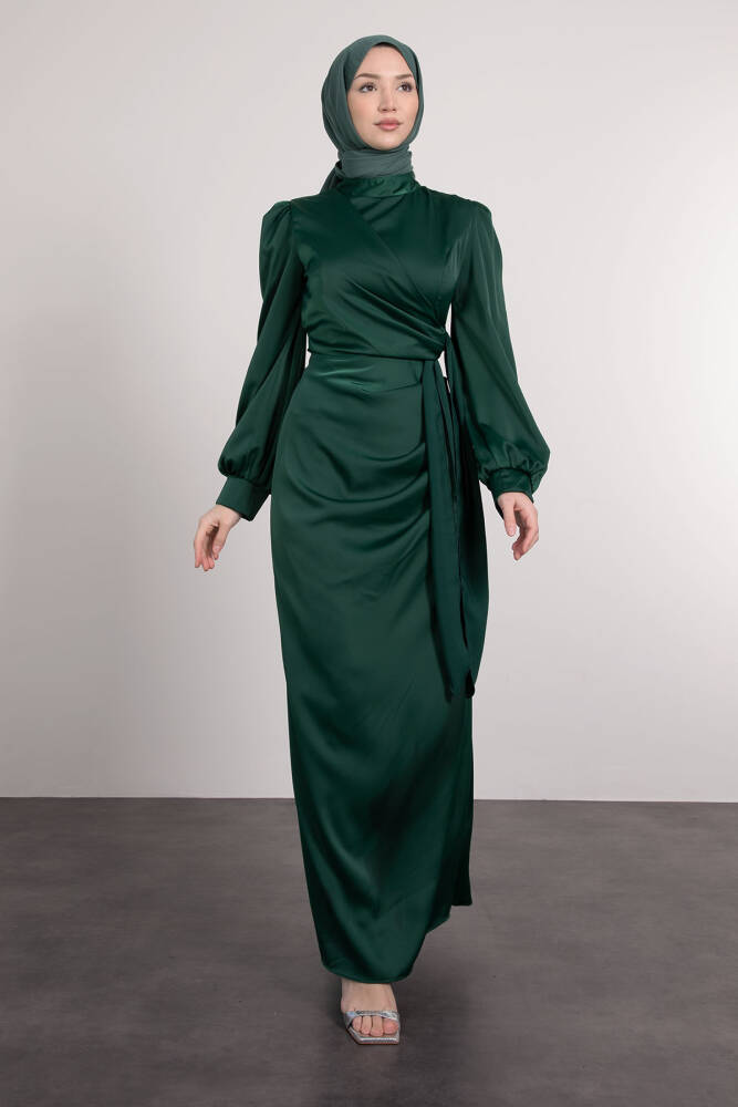 Saten Yan Kuşaklı Elbise Zümrüt