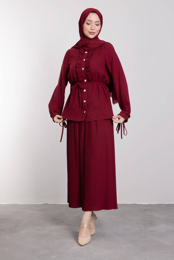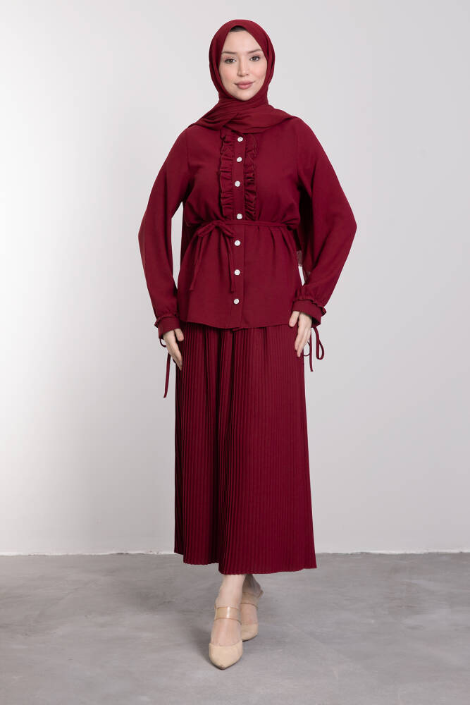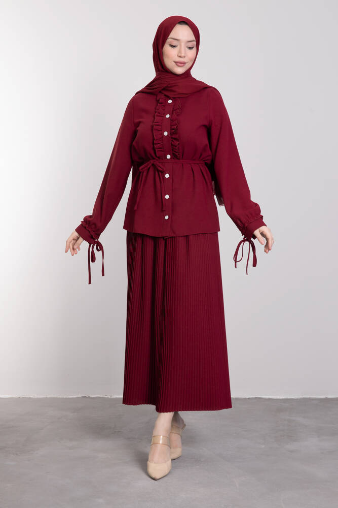 Şerit Fırfırlı Pilise Etekli Takım Bordo