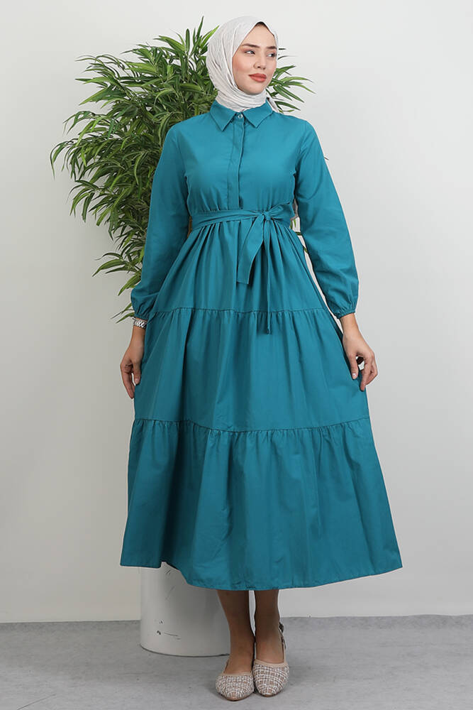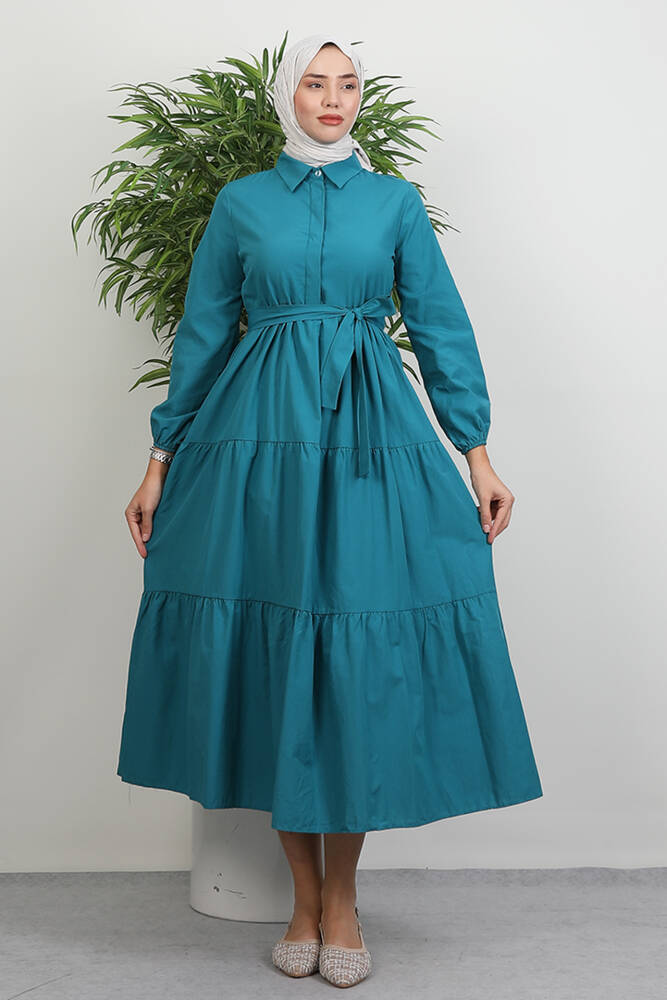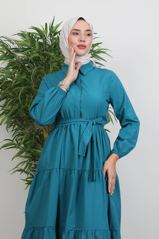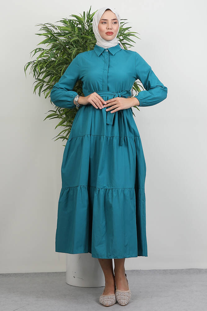 Standart Yaka Düğmeli Elbise Petrol Yeşil