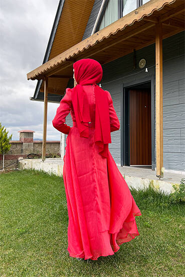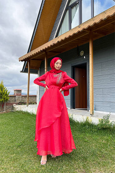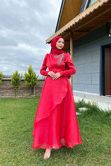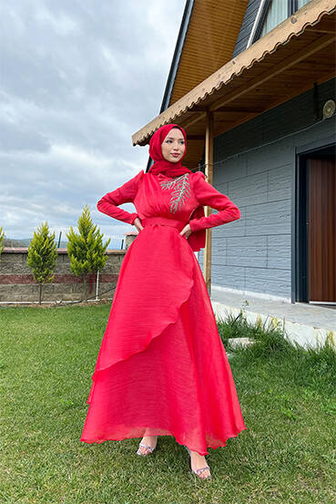 Taşlı Organze Abiye Kırmızı